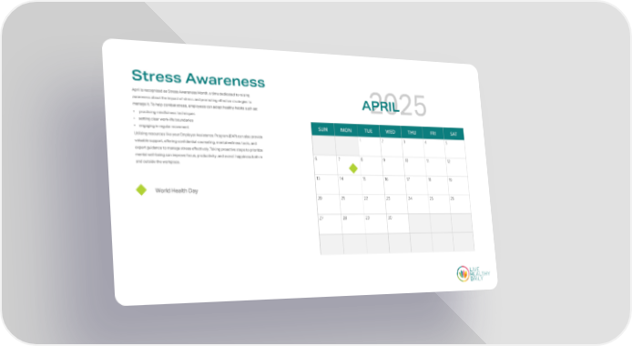 SUN MON TUE WED THU FRI SAT 1 2 3 4 5 6 7 8 9 10 11 12 13 14 15 16 17 18 19 20 21 22 23 24 25 26 27 28 29 30 APRIL Stress Awareness World Health Day April is recognized as Stress Awareness Month, a time dedicated to raising awareness about the impact of stress and promoting effective strategies to manage it. To help combat stress, employees can adopt healthy habits such as: • practicing mindfulness techniques • setting clear work-life boundaries • engaging in regular movement Utilizing resources like your Employer Assistance Program (EAP) can also provide valuable support, offering confidential counseling, mental wellness tools, and expert guidance to manage stress effectively. Taking proactive steps to prioritize mental well-being can improve focus, productivity, and overall happiness both in and outside the workplace.