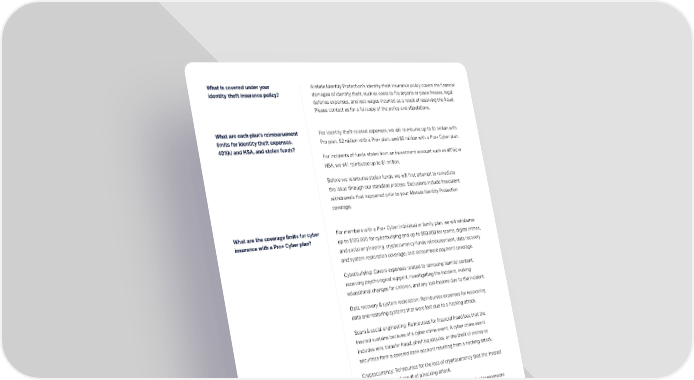 Allstate Identity Protection’s identity theft insurance policy covers the financial damages of identity theft, such as costs to file reports or place freezes, legal defense expenses, and lost wages incurred as a result of resolving the fraud. Please contact us for a full copy of the policy and stipulations. For identity theft-related expenses, we will reimburse up to $1 million with Pro plan, $2 million with a Pro+ plan, and $5 million with a Pro+ Cyber plan. For incidents of funds stolen from an investment account such as 401(k) or HSA, we will reimburse up to $1 million. Before we reimburse stolen funds, we will first attempt to remediate the issue through our standard process. Exclusions include fraudulent withdrawals that happened prior to your Allstate Identity Protection coverage. The Allstate Identity Protection benefit is available to anyone with a valid Social Security number. Coverage can extend to you and all family “under roof or under wallet” as well as any family member 65 or older. You can even protect senior family members aged 65+ who don’t live with you or who are not financially dependent up on you, like parents, in-laws and grandparents. Consult with our Customer Care team, or your benefits department for more details. What is covered under your identity theft insurance policy? What are each plan’s reimbursement limits for identity theft expenses. 401(k) and HSA, and stolen funds? Who is included in the family plan? AIP1046_SUBSCRIBERFAQ_070125 What are the coverage limits for cyber insurance with a Pro+ Cyber plan? For members with a Pro+ Cyber individual or family plan, we will reimburse up to $100,000 for cyberbullying and up to $50,000 for scams, digital crimes, and social engineering, cryptocurrency funds reimbursement, data recovery and system restoration coverage, and ransomware payment coverage. Cyberbullying: Covers expenses related to removing harmful content, receiving psychological support, investigating the incident, making educational changes for children, and any lost income due to the incident. Data recovery & system restoration: Reimburses expenses for recovering data and restoring systems that were lost due to a hacking attack. Scam & social engineering: Reimburses for financial fraud loss that the insured sustains because of a cyber crime event. A cyber crime event includes wire transfer fraud, phishing attacks, or the theft of money or securities from a covered bank account resulting from a hacking attack. Cryptocurrency: Reimburses for the loss of cryptocurrency that the insured sustains as a direct result of a hacking attack. Ransom payment: Covers payments to criminals as a result of ransomware attacks.