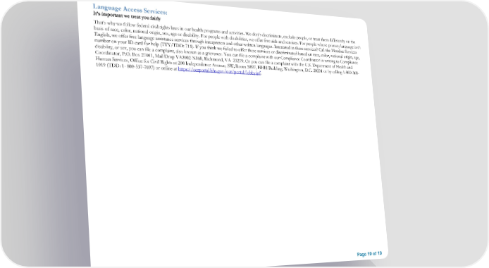 Language Access Services: It’s important we treat you fairly That’s why we follow federal civil rights laws in our health programs and activities. We don’t discriminate, exclude people, or treat them differently on the basis of race, color, national origin, sex, age or disability. For people with disabilities, we offer free aids and services. For people whose primary language isn’t English, we offer free language assistance services through interpreters and other written languages. Interested in these services? Call the Member Services number on your ID card for help (TTY/TDD: 711). If you think we failed to offer these services or discriminated based on race, color, national origin, age, disability, or sex, you can file a complaint, also known as a grievance. You can file a complaint with our Compliance Coordinator in writing to Compliance Coordinator, P.O. Box 27401, Mail Drop VA2002-N160, Richmond, VA 23279. Or you can file a complaint with the U.S. Department of Health and Human Services, Office for Civil Rights at 200 Independence Avenue, SW; Room 509F, HHH Building; Washington, D.C. 20201 or by calling 1-800-368- 1019 (TDD: 1- 800-537-7697) or online at https://ocrportal.hhs.gov/ocr/portal/lobby.jsf. Page 10 of 10