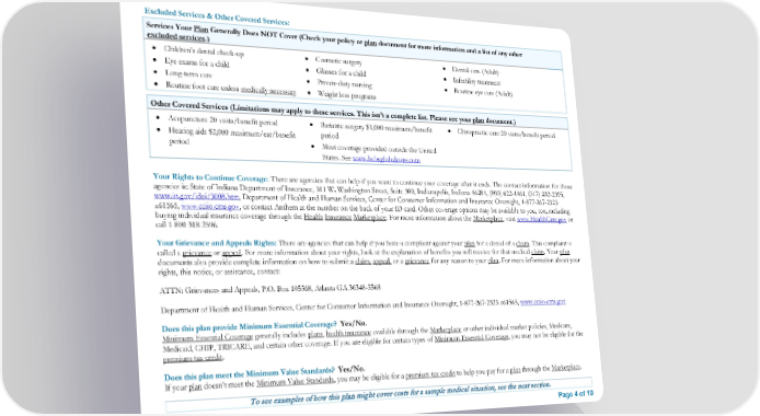 Excluded Services & Other Covered Services: Services Your Plan Generally Does NOT Cover (Check your policy or plan document for more information and a list of any other excluded services.) • Children’s dental check-up • Cosmetic surgery • Dental care (Adult) • Eye exams for a child • Glasses for a child • Infertility treatment • Long-term care • Private-duty nursing • Routine eye care (Adult) • Routine foot care unless medically necessary • Weight loss programs Other Covered Services (Limitations may apply to these services. This isn’t a complete list. Please see your plan document.) • Acupuncture 20 visits/benefit period • Bariatric surgery $1,000 maximum/benefit • Chiropractic care 20 visits/benefit period • Hearing aids $2,000 maximum/ear/benefit period period • Most coverage provided outside the United States. See www.bcbsglobalcore.com Your Rights to Continue Coverage: There are agencies that can help if you want to continue your coverage after it ends. The contact information for those agencies is: State of Indiana Department of Insurance, 311 W. Washington Street, Suite 300, Indianapolis, Indiana 46204, (800) 622-4461, (317) 232-2395, www.in.gov/idoi/3008.htm, Department of Health and Human Services, Center for Consumer Information and Insurance Oversight, 1-877-267-2323 x61565, www.cciio.cms.gov, or contact Anthem at the number on the back of your ID card. Other coverage options may be available to you, too, including buying individual insurance coverage through the Health Insurance Marketplace. For more information about the Marketplace, visit www.HealthCare.gov or call 1-800-318-2596. Your Grievance and Appeals Rights: There are agencies that can help if you have a complaint against your plan for a denial of a claim. This complaint is called a grievance or appeal. For more information about your rights, look at the explanation of benefits you will receive for that medical claim. Your plan documents also provide complete information on how to submit a claim, appeal, or a grievance for any reason to your plan. For more information about your rights, this notice, or assistance, contact: ATTN: Grievances and Appeals, P.O. Box 105568, Atlanta GA 30348-5568 Department of Health and Human Services, Center for Consumer Information and Insurance Oversight, 1-877-267-2323 x61565, www.cciio.cms.gov Does this plan provide Minimum Essential Coverage? Yes/No. Minimum Essential Coverage generally includes plans, health insurance available through the Marketplace or other individual market policies, Medicare, Medicaid, CHIP, TRICARE, and certain other coverage. If you are eligible for certain types of Minimum Essential Coverage, you may not be eligible for the premium tax credit. Does this plan meet the Minimum Value Standards? Yes/No. If your plan doesn’t meet the Minimum Value Standards, you may be eligible for a premium tax credit to help you pay for a plan through the Marketplace. To see examples of how this plan might cover costs for a sample medical situation, see the next section. Page 4 of 10