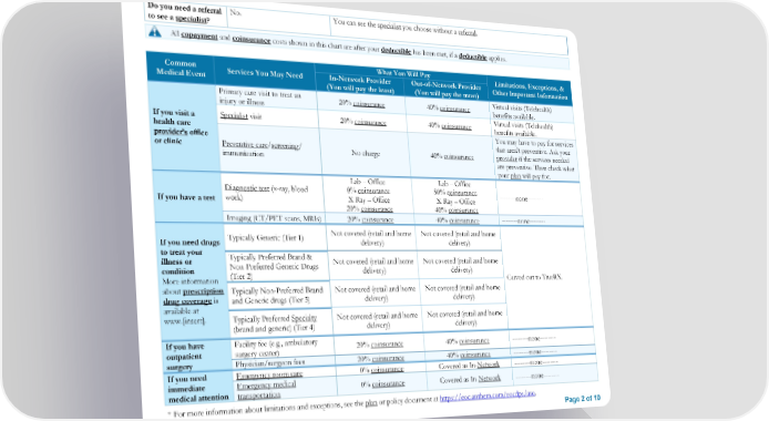 Do you need a referral No. You can see the specialist you choose without a referral. to see a specialist? All copayment and coinsurance costs shown in this chart are after your deductible has been met, if a deductible applies. Common What You Will Pay Limitations, Exceptions, & Medical Event Services You May Need In-Network Provider Out-of-Network Provider Other Important Information (You will pay the least) (You will pay the most) Primary care visit to treat an 20% coinsurance 40% coinsurance Virtual visits (Telehealth) injury or illness benefits available. If you visit a Specialist visit 20% coinsurance 40% coinsurance Virtual visits (Telehealth) health care benefits available. provider’s office You may have to pay for services or clinic Preventive care/screening/ that aren't preventive. Ask your immunization No charge 40% coinsurance provider if the services needed are preventive. Then check what your plan will pay for. Lab – Office Lab – Office Diagnostic test (x-ray, blood 0% coinsurance 50% coinsurance --------none-------- If you have a test work) X-Ray – Office X-Ray – Office 20% coinsurance 40% coinsurance Imaging (CT/PET scans, MRIs) 20% coinsurance 40% coinsurance --------none-------- Typically Generic (Tier 1) Not covered (retail and home Not covered (retail and home If you need drugs delivery) delivery) to treat your Typically Preferred Brand & illness or Non-Preferred Generic Drugs Not covered (retail and home Not covered (retail and home condition (Tier 2) delivery) delivery) More information Carved out to TrueRX. about prescription Typically Non-Preferred Brand Not covered (retail and home Not covered (retail and home drug coverage is and Generic drugs (Tier 3) delivery) delivery) available at www.[insert]. Typically Preferred Specialty Not covered (retail and home Not covered (retail and home (brand and generic) (Tier 4) delivery) delivery) If you have Facility fee (e.g., ambulatory 20% coinsurance 40% coinsurance --------none-------- outpatient surgery center) surgery Physician/surgeon fees 20% coinsurance 40% coinsurance --------none-------- If you need Emergency room care 0% coinsurance Covered as In-Network --------none-------- immediate Emergency medical 0% coinsurance Covered as In-Network --------none-------- medical attention transportation * For more information about limitations and exceptions, see the plan or policy document at https://eoc.anthem.com/eocdps/aso. Page 2 of 10