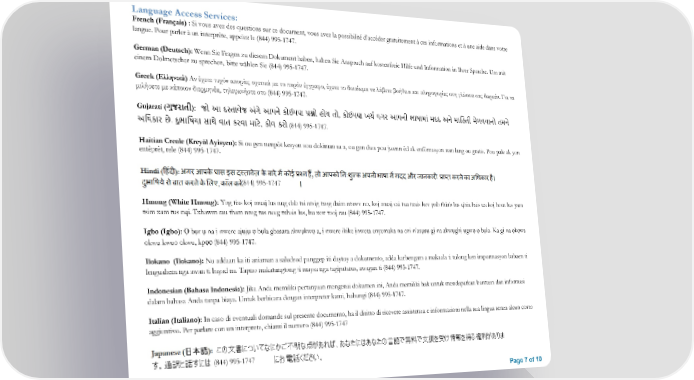 Language Access Services: French (Français) : Si vous avez des questions sur ce document, vous avez la possibilité d’accéder gratuitement à ces informations et à une aide dans votre langue. Pour parler à un interprète, appelez le (844) 995-1747. German (Deutsch): Wenn Sie Fragen zu diesem Dokument haben, haben Sie Anspruch auf kostenfreie Hilfe und Information in Ihrer Sprache. Um mit einem Dolmetscher zu sprechen, bitte wählen Sie (844) 995-1747. Greek (Ελληνικά) Αν έχετε τυχόν απορίες σχετικά με το παρόν έγγραφο, έχετε το δικαίωμα να λάβετε βοήθεια και πληροφορίες στη γλώσσα σας δωρεάν. Για να μιλήσετε με κάποιον διερμηνέα, τηλεφωνήστε στο (844) 995-1747. Gujarati (ગજુ રાતી): જો આ દસ્તાવેજ અંગ ે આપને કોઈપણ ્ᕚ�ો હોય તો, કોઈપણ ખચ� વગર આપની ભાષામા ં મદદ અને માિહતી મેળવવાનો તમન ે અિધકાર છે. દુભાિષયા સાથે વાત કરવા માટે, કોલ કરો (844) 995-1747. Haitian Creole (Kreyòl Ayisyen): Si ou gen nenpòt kesyon sou dokiman sa a, ou gen dwa pou jwenn èd ak enfòmasyon nan lang ou gratis. Pou pale ak yon entèprèt, rele (844) 995-1747. (844) 995-1747 Hmong (White Hmong): Yog tias koj muaj lus nug dab tsi ntsig txog daim ntawv no, koj muaj cai tau txais kev pab thiab lus qhia hais ua koj hom lus yam tsim xam tus nqi. Txhawm rau tham nrog tus neeg txhais lus, hu xov tooj rau (844) 995-1747. Igbo (Igbo): Ọ bụr ụ na ị nwere ajụjụ ọ bụla gbasara akwụkwọ a, ị nwere ikike ịnweta enyemaka na ozi n'asụsụ gị na akwụghị ụgwọ ọ bụla. Ka gị na ọkọwa okwu kwuo okwu, kpọọ (844) 995-1747. Ilokano (Ilokano): Nu addaan ka iti aniaman a saludsod panggep iti daytoy a dokumento, adda karbengam a makaala ti tulong ken impormasyon babaen ti lenguahem nga awan ti bayad na. Tapno makatungtong ti maysa nga tagipatarus, awagan ti (844) 995-1747. Indonesian (Bahasa Indonesia): Jika Anda memiliki pertanyaan mengenai dokumen ini, Anda memiliki hak untuk mendapatkan bantuan dan informasi dalam bahasa Anda tanpa biaya. Untuk berbicara dengan interpreter kami, hubungi (844) 995-1747. Italian (Italiano): In caso di eventuali domande sul presente documento, ha il diritto di ricevere assistenza e informazioni nella sua lingua senza alcun costo aggiuntivo. Per parlare con un interprete, chiami il numero (844) 995-1747 (844) 995-1747 Page 7 of 10