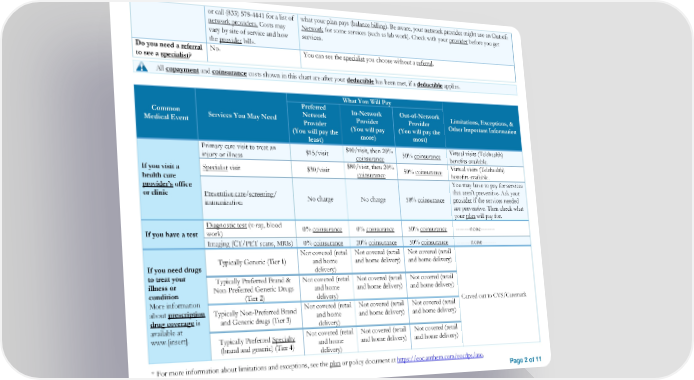 or call (833) 578-4441 for a list of what your plan pays (balance billing). Be aware, your network provider might use an Out-of- network providers. Costs may Network for some services (such as lab work). Check with your provider before you get vary by site of service and how services. the provider bills. Do you need a referral No. You can see the specialist you choose without a referral. to see a specialist? All copayment and coinsurance costs shown in this chart are after your deductible has been met, if a deductible applies. What You Will Pay Preferred In-Network Out-of-Network Common Services You May Need Network Provider Provider Limitations, Exceptions, & Medical Event Provider (You will pay (You will pay the Other Important Information (You will pay the more) most) least) Primary care visit to treat an $15/visit $40/visit, then 20% 50% coinsurance Virtual visits (Telehealth) injury or illness coinsurance benefits available. If you visit a Specialist visit $30/visit $80/visit, then 20% 50% coinsurance Virtual visits (Telehealth) health care coinsurance benefits available. provider’s office You may have to pay for services or clinic Preventive care/screening/ that aren't preventive. Ask your immunization No charge No charge 50% coinsurance provider if the services needed are preventive. Then check what your plan will pay for. Diagnostic test (x-ray, blood 0% coinsurance 0% coinsurance 50% coinsurance --------none-------- If you have a test work) Imaging (CT/PET scans, MRIs) 0% coinsurance 20% coinsurance 50% coinsurance --------none-------- Not covered (retail Not covered (retail Not covered (retail If you need drugs Typically Generic (Tier 1) and home and home delivery) and home delivery) to treat your delivery) illness or Typically Preferred Brand & Not covered (retail Not covered (retail Not covered (retail condition Non-Preferred Generic Drugs and home and home delivery) and home delivery) More information (Tier 2) delivery) Carved out to CVS/Caremark about prescription Typically Non-Preferred Brand Not covered (retail Not covered (retail Not covered (retail drug coverage is and Generic drugs (Tier 3) and home and home delivery) and home delivery) available at delivery) www.[insert]. Typically Preferred Specialty Not covered (retail Not covered (retail Not covered (retail (brand and generic) (Tier 4) and home and home delivery) and home delivery) delivery) * For more information about limitations and exceptions, see the plan or policy document at https://eoc.anthem.com/eocdps/aso. Page 2 of 11