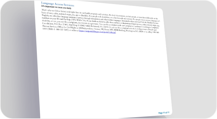 Language Access Services: It’s important we treat you fairly That’s why we follow federal civil rights laws in our health programs and activities. We don’t discriminate, exclude people, or treat them differently on the basis of race, color, national origin, sex, age or disability. For people with disabilities, we offer free aids and services. For people whose primary language isn’t English, we offer free language assistance services through interpreters and other written languages. Interested in these services? Call the Member Services number on your ID card for help (TTY/TDD: 711). If you think we failed to offer these services or discriminated based on race, color, national origin, age, disability, or sex, you can file a complaint, also known as a grievance. You can file a complaint with our Compliance Coordinator in writing to Compliance Coordinator, P.O. Box 27401, Mail Drop VA2002-N160, Richmond, VA 23279. Or you can file a complaint with the U.S. Department of Health and Human Services, Office for Civil Rights at 200 Independence Avenue, SW; Room 509F, HHH Building; Washington, D.C. 20201 or by calling 1-800-368- 1019 (TDD: 1- 800-537-7697) or online at https://ocrportal.hhs.gov/ocr/portal/lobby.jsf. Page 11 of 11