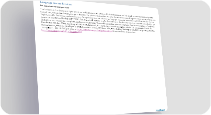 Language Access Services: 10 of " It’s important we treat you fairly That’s why we follow federal civil rights laws in our health programs and activities. We don’t discriminate, exclude people, or treat them differently on the basis of race, color, national origin, sex, age or disability. For people with disabilities, we offer free aids and services. For people whose primary language isn’t English, we offer free language assistance services through interpreters and other written languages. Interested in these services? Call the Member Services number on your ID card for help (TTY/TDD: 711). If you think we failed to offer these services or discriminated based on race, color, national origin, age, disability, or sex, you can file a complaint, also known as a grievance. You can file a complaint with our Compliance Coordinator in writing to Compliance Coordinator, P.O. Box 27401, Mail Drop VA2002-N160, Richmond, VA 23279. Or you can file a complaint with the U.S. Department of Health and Human Services, Office for Civil Rights at 200 Independence Avenue, SW; Room 509F, HHH Building; Washington, D.C. 20201 or by calling 1-800-368- 1019 (TDD: 1- 800-537-7697) or online at https://ocrportal.hhs.gov/ocr/portal/lobby.jsf. Complaint forms are available at http://www.hhs.gov/ocr/office/file/index.html.