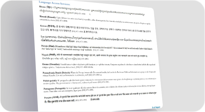 Language Access Services: 8 of " (855) 871-4901 Kirundi (Kirundi): Ugize ikibazo ico arico cose kuri iyi nyandiko, ufise uburenganzira bwo kuronka ubufasha mu rurimi rwawe ata giciro. Kugira uvugishe umusemuzi, akura (855) 871-4901. Korean (한국어): 본 문서에 대해 어떠한 문의사항이라도 있을 경우, 귀하에게는 귀하가 사용하는 언어로 무료 도움 및 정보를 얻을 권리가 있습니다. 통역사와 이야기하려면 (855) 871-4901 로 문의하십시오. (855) 871-4901. (855) 871-4901. (855) 871-4901 Oromo (Oromifaa): Sanadi kanaa wajiin walqabaate gaffi kamiyuu yoo qabduu tanaan, Gargaarsa argachuu fi odeeffanoo afaan ketiin kaffaltii alla argachuuf mirgaa qabdaa. Turjumaana dubaachuuf, (855) 871-4901 bilbilla. Pennsylvania Dutch (Deitsch): Wann du Frooge iwwer selle Document hoscht, du hoscht die Recht um Helfe un Information zu griege in dei Schprooch mitaus Koscht. Um mit en Iwwersetze zu schwetze, ruff (855) 871-4901 aa. Polish (polski): W przypadku jakichkolwiek pytań związanych z niniejszym dokumentem masz prawo do bezpłatnego uzyskania pomocy oraz informacji w swoim języku. Aby porozmawiać z tłumaczem, zadzwoń pod numer (855) 871-4901. Portuguese (Português): Se tiver quaisquer dúvidas acerca deste documento, tem o direito de solicitar ajuda e informações no seu idioma, sem qualquer custo. Para falar com um intérprete, ligue para (855) 871-4901. (855) 871-4901