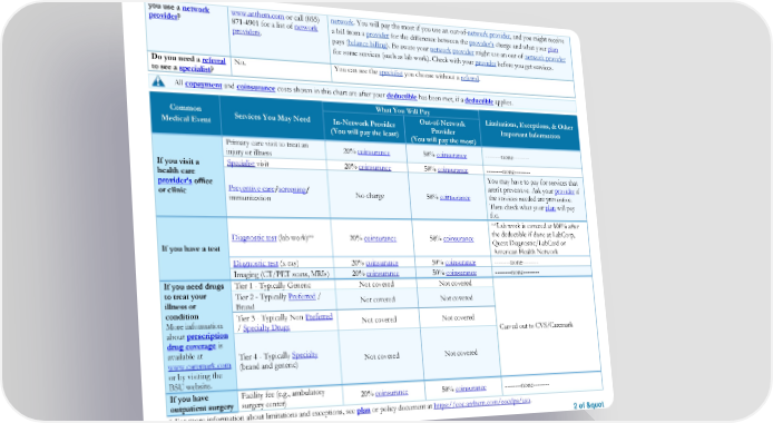 * For more information about limitations and exceptions, see plan or policy document at https://eoc.anthem.com/eocdps/aso. 2 of " you use a network provider? www.anthem.com or call (855) 871-4901 for a list of network providers. network. You will pay the most if you use an out-of-network provider, and you might receive a bill from a provider for the difference between the provider’s charge and what your plan pays (balance billing). Be aware your network provider might use an out-of-network provider for some services (such as lab work). Check with your provider before you get services. Do you need a referral to see a specialist? No. You can see the specialist you choose without a referral. All copayment and coinsurance costs shown in this chart are after your deductible has been met, if a deductible applies. Common Medical Event Services You May Need What You Will Pay Limitations, Exceptions, & Other Important Information In-Network Provider (You will pay the least) Out-of-Network Provider (You will pay the most) If you visit a health care provider’s office or clinic Primary care visit to treat an injury or illness 20% coinsurance 50% coinsurance --------none-------- Specialist visit 20% coinsurance 50% coinsurance --------none-------- Preventive care/screening/ immunization No charge 50% coinsurance You may have to pay for services that aren't preventive. Ask your provider if the services needed are preventive. Then check what your plan will pay for. If you have a test Diagnostic test (lab work)** 20% coinsurance 50% coinsurance **Lab work is covered at 100% after the deductible if done at LabCorp, Quest Diagnostic/LabCard or American Health Network Diagnostic test (x-ray) 20% coinsurance 50% coinsurance --------none-------- Imaging (CT/PET scans, MRIs) 20% coinsurance 50% coinsurance --------none-------- If you need drugs to treat your illness or condition More information about prescription drug coverage is available at www.caremark.com or by visiting the BSU website. Tier 1 - Typically Generic Not covered Not covered Carved out to CVS/Caremark Tier 2 - Typically Preferred / Brand Not covered Not covered Tier 3 - Typically Non-Preferred / Specialty Drugs Not covered Not covered Tier 4 - Typically Specialty (brand and generic) Not covered Not covered If you have outpatient surgery Facility fee (e.g., ambulatory surgery center) 20% coinsurance 50% coinsurance --------none--------