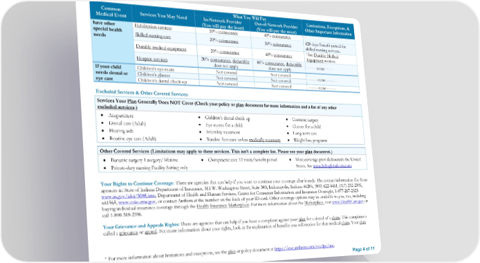 * For more information about limitations and exceptions, see the plan or policy document at https://eoc.anthem.com/eocdps/aso. Page 4 of 11 Common Medical Event Services You May Need What You Will Pay Limitations, Exceptions, & Other Important Information In-Network Provider (You will pay the least) Out-of-Network Provider (You will pay the most) have other special health needs Habilitation services 20% coinsurance 40% coinsurance Skilled nursing care 20% coinsurance 30% coinsurance 120 days/benefit period for skilled nursing services. Durable medical equipment 20% coinsurance 40% coinsurance *See Durable Medical Equipment section. Hospice services 20% coinsurance, deductible does not apply 40% coinsurance, deductible does not apply --------none-------- If your child needs dental or eye care Children’s eye exam Not covered Not covered --------none-------- Children’s glasses Not covered Not covered Children’s dental check-up Not covered Not covered --------none-------- Excluded Services & Other Covered Services: Services Your Plan Generally Does NOT Cover (Check your policy or plan document for more information and a list of any other excluded services.) • Acupuncture • Dental care (Adult) • Hearing aids • Routine eye care (Adult) • Children’s dental check-up • Eye exams for a child • Infertility treatment • Routine foot care unless medically necessary • Cosmetic surgery • Glasses for a child • Long-term care • Weight loss programs Other Covered Services (Limitations may apply to these services. This isn’t a complete list. Please see your plan document.) • Bariatric surgery 1 surgery/ lifetime • Private-duty nursing Facility Setting only • Chiropractic care 12 visits/benefit period • Most coverage provided outside the United States. See www.bcbsglobalcore.com Your Rights to Continue Coverage: There are agencies that can help if you want to continue your coverage after it ends. The contact information for those agencies is: State of Indiana Department of Insurance, 311 W. Washington Street, Suite 300, Indianapolis, Indiana 46204, (800) 622-4461, (317) 232-2395, www.in.gov/idoi/3008.htm, Department of Health and Human Services, Center for Consumer Information and Insurance Oversight, 1-877-267-2323 x61565, www.cciio.cms.gov, or contact Anthem at the number on the back of your ID card. Other coverage options may be available to you, too, including buying individual insurance coverage through the Health Insurance Marketplace. For more information about the Marketplace, visit www.HealthCare.gov or call 1-800-318-2596. Your Grievance and Appeals Rights: There are agencies that can help if you have a complaint against your plan for a denial of a claim. This complaint is called a grievance or appeal. For more information about your rights, look at the explanation of benefits you will receive for that medical claim. Your plan