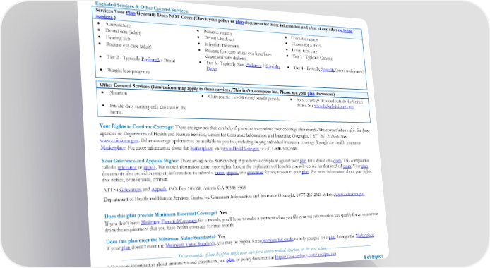 * For more information about limitations and exceptions, see plan or policy document at https://eoc.anthem.com/eocdps/aso. 4 of " Excluded Services & Other Covered Services: Services Your Plan Generally Does NOT Cover (Check your policy or plan document for more information and a list of any other excluded services.) • Acupuncture • Bariatric surgery • Cosmetic surgery • Dental care (adult) • Dental Check-up • Glasses for a child • Hearing aids • Infertility treatment • Long- term care • Routine eye care (adult) • Routine foot care unless you have been diagnosed with diabetes. • Tier 1 - Typically Generic • Tier 2 - Typically Preferred / Brand • Tier 3 - Typically Non-Preferred / Specialty Drugs • Tier 4 - Typically Specialty (brand and generic) • Weight loss programs Other Covered Services (Limitations may apply to these services. This isn’t a complete list. Please see your plan document.) • Abortion • Chiropractic care 24 visits/benefit period. • Most coverage provided outside the United States. See www.bcbsglobalcore.com • Private-duty nursing only covered in the home. Your Rights to Continue Coverage: There are agencies that can help if you want to continue your coverage after it ends. The contact information for those agencies is: Department of Health and Human Services, Center for Consumer Information and Insurance Oversight, 1-877-267-2323 x61565, www.cciio.cms.gov. Other coverage options may be available to you too, including buying individual insurance coverage through the Health Insurance Marketplace. For more information about the Marketplace, visit www.HealthCare.gov or call 1-800-318-2596. Your Grievance and Appeals Rights: There are agencies that can help if you have a complaint against your plan for a denial of a claim. This complaint is called a grievance or appeal. For more information about your rights, look at the explanation of benefits you will receive for that medical claim. Your plan documents also provide complete information to submit a claim, appeal, or a grievance for any reason to your plan. For more information about your rights, this notice, or assistance, contact: ATTN: Grievances and Appeals, P.O. Box 105568, Atlanta GA 30348-5568 Department of Health and Human Services, Center for Consumer Information and Insurance Oversight, 1-877-267-2323 x61565, www.cciio.cms.gov Does this plan provide Minimum Essential Coverage? Yes If you don’t have Minimum Essential Coverage for a month, you’ll have to make a payment when you file your tax return unless you qualify for an exemption from the requirement that you have health coverage for that month. Does this plan meet the Minimum Value Standards? Yes If your plan doesn’t meet the Minimum Value Standards, you may be eligible for a premium tax credit to help you pay for a plan through the Marketplace. ––––––––––––––––––––––To see examples of how this plan might cover costs for a sample medical situation, see the next section.––––––––––––––––––––––