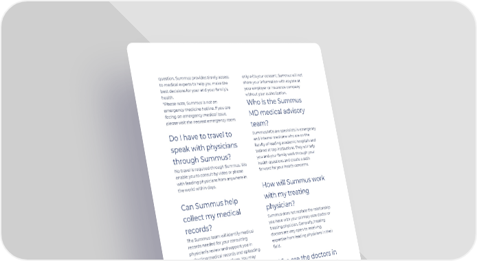 question. Summus provides timely access only with your consent. Summus will not to medical experts to help you make the share your information with anyone at best decisions for your and your family’s your employer or insurance company health. without your authorization. *Please note, Summus is not an Who is the Summus emergency medicine hotline. If you are facing an emergency medical issue, MD medical advisory please visit the nearest emergency room team? Do I have to travel to Summus MDs are specialists in emergency speak with physicians and internal medicine who are on the faculty of leading academic hospitals and through Summus? trained at top institutions. They will help you and your family work through your No travel is required through Summus. We health questions and create a path enable you to consult by video or phone forward for your health concerns. with leading physicians from anywhere in the world within days. How will Summus work Can Summus help with my treating collect my medical physician? records? Summus does not replace the relationship you have with your primary care doctor or The Summus team will identify medical treating physician. Generally, treating records needed for your consulting doctors are very open to receiving physician’s review and support you in expertise from leading physicians in their collecting medical records and uploading field. them to our secure platform. You may access your case-related records at any Who are the doctors in time. the Summus network? Does Summus share Summus-affiliated physicians are leaders information about in their respective fields, have thousands of hours of practical experience, are on the my case? cutting edge of research and innovation, and are associated with the best medical Summus is fully HIPAA-compliant and will institutions and practices. Doctors who protect your health privacy. We will store join our network are vetted by our in- your case-related medical records and house medical team. Each physician is share them with your consulting physician board certified in their specialty. Today, the