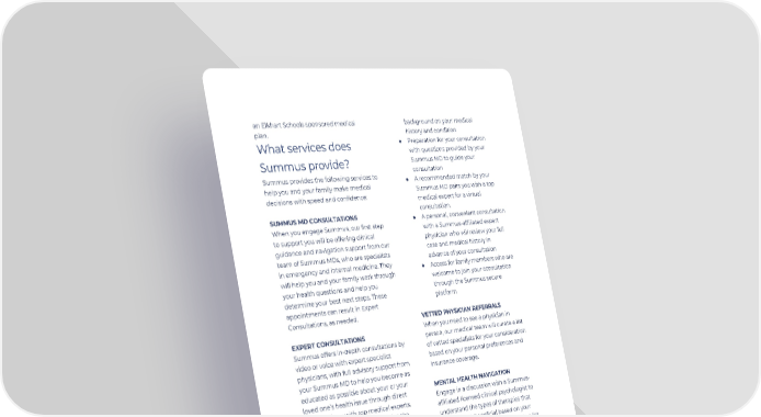 an Elkhart Schools sponsored medical background on your medical plan. history and condition What services does ï Preparation for your consultation with questions provided by your Summus provide? Summus MD to guide your Summus provides the following services to consultation help you and your family make medical ï A recommended match by your decisions with speed and confidence: Summus MD pairs you with a top medical expert for a virtual SUMMUS MD CONSULTATIONS consultation. When you engage Summus, our first step ï A personal, convenient consultation to support you will be offering clinical with a Summus-affiliated expert guidance and navigation support from our physician who will review your full team of Summus MDs, who are specialists case and medical history in in emergency and internal medicine. They advance of your consultation will help you and your family work through ï Access for family members who are your health questions and help you welcome to join your consultation determine your best next steps. These through the Summus secure appointments can result in Expert platform Consultations, as needed. VETTED PHYSICIAN REFERRALS EXPERT CONSULTATIONS When you need to see a physician in Summus offers in-depth consultations by person, our medical team will curate a list video or voice with expert specialist of vetted specialists for your consideration physicians, with full advisory support from based on your personal preferences and your Summus MD to help you become as insurance coverage. educated as possible about your or your loved one’s health issue through direct MENTAL HEALTH NAVIGATION conversations with top medical experts. Engage in a discussion with a Summus- Each Expert Consultation includes the affiliated licensed clinical psychologist to following services: understand the types of therapies that may be most beneficial based on your ï An initial intake call with a concerns. Our team will then curate a list dedicated Summus MD, who is of vetted therapists based on your trained in emergency or internal discussion, taking into account your medicine, to help you fully personal preferences and insurance understand your diagnosis or coverage. health question ï Collection of medical records and a SUMMUS WELLBEING prepared summary for your Developed by physicians board-certified in consulting specialist with full Lifestyle Medicine, Summus Wellbeing provides highly personalized guidance and