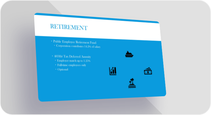 RETIREMENT Public Employee Retirement Fund Corporation contributes 14.2% of salary 403(b) Tax Deferred Annuity Employer match up to 1.25% Full-time employees only Optional