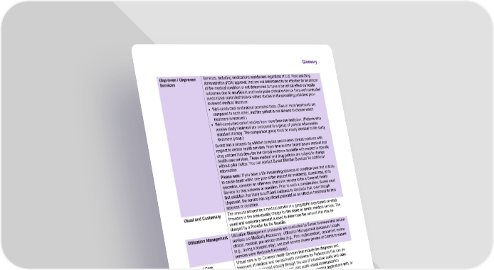 Glossary Property of Bind Benefits, Inc., d/b/a Surest. All rights reserved © 2026. 99 Unproven / Unproven Services Services, including medications and devices regardless of U.S. Food and Drug Administration (FDA) approval, that are not determined to be effective for treatment of the medical condition or not determined to have a beneficial effect on health outcomes due to insufficient and inadequate clinical evidence from well-conducted randomized controlled trials or cohort studies in the prevailing published peer- reviewed medical literature: • Well-conducted randomized controlled trials. (Two or more treatments are compared to each other, and the patient is not allowed to choose which treatment is received.) • Well-conducted cohort studies from more than one institution. (Patients who receive study treatment are compared to a group of patients who receive standard therapy. The comparison group must be nearly identical to the study treatment group.) Surest has a process by which it compiles and reviews clinical evidence with respect to certain health services. From time-to-time Surest issues medical and drug policies that describe the clinical evidence available with respect to specific health care services. These medical and drug policies are subject to change without prior notice. You can contact Surest Member Services for additional information. Please note: If you have a life-threatening sickness or condition (one that is likely to cause death within one year of the request for treatment), Surest may, at its discretion, consider an otherwise Unproven service to be a Covered Health Service for that sickness or condition. Prior to such a consideration, Surest must first establish that there is sufficient evidence to conclude that, even though Unproven, the service has significant potential as an effective treatment for that sickness or condition. Usual and Customary The amount allowed for a medical service in a geographic area based on what Providers in the area usually charge for the same or similar medical service. The usual and customary amount is used to determine the amount that may be charged by a Provider for the Benefits. Utilization Management Utilization Management processes are conducted by Surest to ensure that certain services are Medically Necessary. Utilization Management processes include clinical, medical, pre-service review (e.g., Prior Authorization), concurrent review (e.g., during a hospital stay), and post-service review (review of Claims to ensure services were Medically Necessary). Virtual Care Virtual care is for Covered Health Services that include the diagnosis and treatment of medical and mental health conditions for Participants that can be appropriately managed virtually through the use of interactive audio and video telecommunication and transmissions, and audio-visual communication technology, or through federally compliant secure messaging applications with, or supervised by, a licensed and qualified practitioner. Virtual care provides communication of medical information in real-time between the patient and a distant Physician or health care Specialist, through use of interactive audio and video communications equipment or through federally compliant secure messaging applications outside of a medical facility (for example, from home or from work).