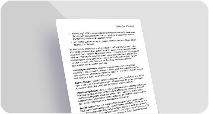 Continuation of Coverage Property of Bind Benefits, Inc., d/b/a Surest. All rights reserved © 2026. 73 • After electing COBRA, the qualified beneficiary becomes covered under another group plan (as an employee or otherwise) that has no exclusion or limitation with respect to any preexisting condition of the qualified beneficiary. • After electing COBRA coverage, the qualified beneficiary becomes entitled to (actually covered under) Medicare. The Participant (or a representative acting on behalf of the Participant) must notify the Plan Administrator immediately if any qualified beneficiary actually becomes covered by another group health plan or Medicare. Regardless of when such notification is provided, coverage will terminate on the date of the coverage under the other group health plan or Medicare. If, for whatever reason, a qualified beneficiary receives any Benefits under the Surest Plan after coverage is to cease under these rules, the Surest Plan reserves the right to seek reimbursement from the qualified beneficiary. Insurability and Conversion. A qualified beneficiary does not have to demonstrate insurability to elect continuation coverage. At the conclusion of the available continuation coverage, the Plan Administrator will provide an opportunity to convert to individual coverage if such coverage is offered under the Surest Plan. Address Changes. Important information is distributed by mail. To protect your rights and the rights of your family, if a qualified beneficiary’s address changes, the qualified beneficiary or someone on his/her behalf should notify the Plan Administrator immediately. Other Coverage Options. Instead of enrolling in COBRA continuation coverage, there may be other coverage options through the Health Insurance Marketplace, Medicaid, or other group health plan coverage options (such as a spouse’s plan) through what is called a “special enrollment period.” Some of these options may cost less than COBRA continuation coverage. You can learn more about many of these options at healthcare.gov. More Information. You should contact the Plan Administrator with any questions about COBRA continuation coverage. Also, for more information about COBRA, HIPAA, and other laws affecting group health plans, contact the nearest Regional or District Office of the U.S. Department of Labor’s Employee Benefits Security Administration (EBSA) in your area or visit the EBSA website dol.gov/ebsa. (Addresses and phone numbers of Regional and District EBSA Offices are available through EBSA’s website.) Continuation Rights under Uniformed Services Employment and Reemployment Rights Act (USERRA) Although USERRA protections look similar to COBRA protections, USERRA rights are separate and independent from COBRA rights. In addition to COBRA rights, a Participant may be entitled to continue coverage under the Uniformed Services Employment and Reemployment Rights Act of 1994 (USERRA). USERRA requires your employer to offer employees and their spouse and/or dependent children the opportunity to pay for a temporary extension of health coverage (called “USERRA continuation coverage”) at group rates where health coverage under employer-sponsored group health