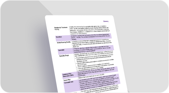 Glossary Property of Bind Benefits, Inc., d/b/a Surest. All rights reserved © 2026. 98 Residential Treatment Facility A facility that is licensed by the appropriate state agency, has, or maintains a written, specific, and detailed treatment program requiring full-time residence and participation, and provides 24-hour-a-day care in a structured setting, supervision, food, lodging, rehabilitation, or treatment for an illness related to mental health and substance use related disorders. Secretary As that term applied in the No Surprises Act of the Consolidated Appropriations Act (P.L. 116-260). This definition encompasses the secretary of HHS, DOL and Treasury. Skilled Nursing Facility A hospital or nursing facility that is licensed and operated as required by law. Medicare licensed bed or facility (including an extended care facility, a long-term acute care facility, a hospital swing-bed, and a transitional care unit) that provides skilled care. Specialist A Physician who has a majority of their practice in areas other than those practicing in the areas of family practice, general medicine, internal medicine, obstetrics/gynecology or general pediatrics. Specialty Drugs Infusions, injectables and non-injectable prescription drugs, as determined by the Claim Administrator, which have one or more of the following key characteristics: • Frequent dosing adjustments and intensive clinical monitoring are required to decrease the potential for drug toxicity and to increase the probability for beneficial outcomes. • Intensive patient training and compliance assistance are required to facilitate therapeutic goals. • There is limited or exclusive product availability and/or distribution. • There are specialized product handling and/or administration requirements. • Are produced by living organisms or their products. Summary Plan Description (SPD) The document describing, among other things, the Benefits offered under the Noblesville Schools: Surest Plan and your rights and obligations under such benefit option. Surest Plan Refers to the Surest health plan as used in this SPD. Telehealth Visit Live interactive audio with visual transmissions, and/or transmissions through federally compliant secure messaging applications of a Physician-patient encounter from one site to another using telecommunications technology. The site may be a CMS defined originating facility or another location such as a Participant’s home or place of work. Telehealth/Telemedicine does not include virtual care services provided by a Designated Virtual Network Provider. Transition of Care The option for a new Participant to request coverage from your current, out-of- network health care professional at in-network rates for a limited time due to a specific medical condition, until the safe transfer to an in-network health care professional can be arranged.