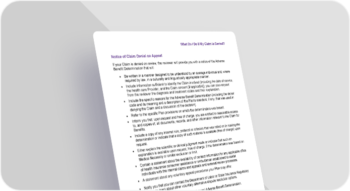 What Do I Do If My Claim Is Denied? Property of Bind Benefits, Inc., d/b/a Surest. All rights reserved © 2026. 62 Notice of Claim Denial on Appeal If your Claim is denied on review, the reviewer will provide you with a notice of the Adverse Benefit Determination that will: • Be written in a manner designed to be understood by an average individual and, where required by law, in a culturally and linguistically appropriate manner. • Include information sufficient to identify the Claim involved (including the date of service, the health care Provider, and the Claim amount [if applicable]); you can also request from the reviewer the diagnosis and treatment codes and their explanation. • Include the specific reasons for the Adverse Benefit Determination (including the denial code and its meaning and a description of the Plan's standard, if any, that was used in denying the Claim and a discussion of the decision). • Refer to the specific Plan provisions on which the determination was based. • Inform you that, upon request and free of charge, you are entitled to reasonable access to, and copies of, all documents, records, and other information relevant to the Claim for Benefits. • Include a copy of any internal rule, protocol or criterion that was relied on in making the determination or indicate that a copy of such material is available (free of charge) upon request. • Either explain the scientific or clinical judgment made or indicate that such an explanation is available upon request, free of charge, if the determination was based on Medical Necessity or similar exclusion or limit. • Contain a statement about the availability of contact information for any applicable office of health insurance consumer assistance or ombudsman established to assist individuals with the internal claims and appeals and external review processes. • A statement about any voluntary appeal procedures your Plan may offer. • Notify you that you can contact the Department of Labor or State Insurance Regulatory Agency to learn about other voluntary alternative dispute resolution options. The reviewer’s decision on appeal is the final internal Adverse Benefit Determination. Federal External Review Program If, after exhausting your internal appeals, you are not satisfied with the determination made by Surest, you may be entitled to request an external review. The process is available at no charge to you. You can also start the external review process without exhausting the internal appeals if Surest fails to follow the internal appeals process described above (unless it is a minor failure).