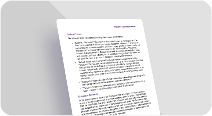 What Else Do I Need to Know? Property of Bind Benefits, Inc., d/b/a Surest. All rights reserved © 2026. 86 Defined Terms The following terms have special meanings for purposes of this section: • "Recover," "Recovered," "Recovery" or "Recoveries" means all monies paid by a Third Party to, or on behalf of, a Participant by way of judgment, settlement, or otherwise to compensate for all losses caused by an illness or injury, whether or not said monies are characterized as medical expenses covered by the Plan/Surest Plan. "Recoveries" includes, but is not limited to, Recoveries for medical expenses, attorney's fees, costs and expenses, pain and suffering, loss of consortium, wrongful death, lost wages, and any other Recovery of any form of damages or compensation whatsoever. • "Refund" means repayment to the Plan/Surest Plan for medical Benefits that the Plan/Surest Plan has paid toward care and treatment of an illness or injury suffered by a Participant as the result of acts or omissions of a Third Party. This right of Refund includes Recoveries by a Participant under an uninsured or underinsured motorist insurance policy, homeowner's policy, renter's policy, medical malpractice policy, or any liability insurance policy (each of which will be treated as Third Party coverage under this article). • "Subrogation" means the Plan’s/Surest Plan's right to pursue and place a lien upon the Participant's claims for medical expenses against the other person. • "Third Party" means any individual or entity (including an insurance company) who is legally obligated to pay a Recovery to, or on behalf of, a Participant. Erroneous Payments To the extent payments made by the Plan/Surest Plan with respect to a Participant are in excess of the maximum amount of payment necessary under the terms of the Plan/Surest Plan, the Plan/Surest Plan shall have the right to Recover such payments, to the extent of such excess from any one or more of the following sources, as the Plan/Surest Plan shall determine any person to or with respect to whom such payments are made, or such person’s legal representative, any insurance companies, or any other individuals or organizations which the Plan/Surest Plan determines are either responsible for payment or received payment in error, and any future Benefits payable to the Participant. Excess Insurance Except as otherwise provided under Section 11.2 (Coordination of Benefits) the following rule applies: • If there is available, or potentially available, any coverage (including coverage resulting from a judgment at law or settlements), the Benefits under the Plan/Surest Plan shall apply only as an excess over such other sources of coverage, except as otherwise provided for under Section 11.2 (Coordination of Benefits). • The Plan’s/Surest Plan’s Benefits shall be excess to: − The responsible party, its insurer, or any other sources on behalf of that party.