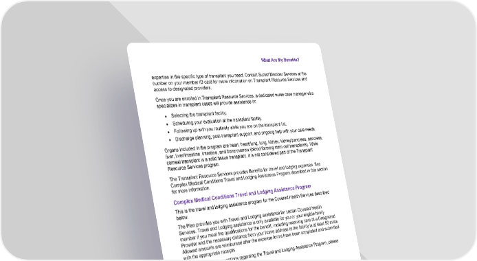What Are My Benefits? Property of Bind Benefits, Inc., d/b/a Surest. All rights reserved © 2026. 38 expertise in the specific type of transplant you need. Contact Surest Member Services at the number on your member ID card for more information on Transplant Resource Services and access to designated providers. Once you are enrolled in Transplant Resource Services, a dedicated nurse case manager who specializes in transplant cases will provide assistance in: • Selecting the transplant facility. • Scheduling your evaluation at the transplant facility. • Following up with you routinely while you are on the transplant list. • Discharge planning, post-transplant support, and ongoing help with your care needs. Organs included in the program are heart, heart/lung, lung, kidney, kidney/pancreas, pancreas, liver, liver/intestine, intestine, and bone marrow (blood forming stem cell transplants). While corneal transplant is a solid tissue transplant, it is not considered part of the Transplant Resource Services program. The Transplant Resource Services provides Benefits for travel and lodging expenses. See Complex Medical Conditions Travel and Lodging Assistance Program described in this section for more information. Complex Medical Conditions Travel and Lodging Assistance Program This is the travel and lodging assistance program for the Covered Health Services described below. The Plan provides you with Travel and Lodging assistance for certain Covered Health Services. Travel and Lodging assistance is only available for you or your eligible family member if you meet the qualifications for the benefit, including receiving care at a Designated Provider and the necessary distance from your home address to the facility is at least 50 miles. Allowed amounts are reimbursed after the expense forms have been completed and submitted with the appropriate receipts. If you have specific questions regarding the Travel and Lodging Assistance Program, please call Surest Member Services. Travel and Lodging Expenses The Plan covers expenses for travel and lodging for the Participant and a travel companion as follows: • Transportation of the Participant and one companion who is traveling on the same day(s) to and/or from the site of the qualified procedure provided by a Designated Provider for care related to one of the programs listed below. • The eligible expenses for lodging for the Participant (while not a hospital inpatient) and one companion. • If the Participant is an enrolled dependent minor child, the transportation expenses of two companions will be covered.