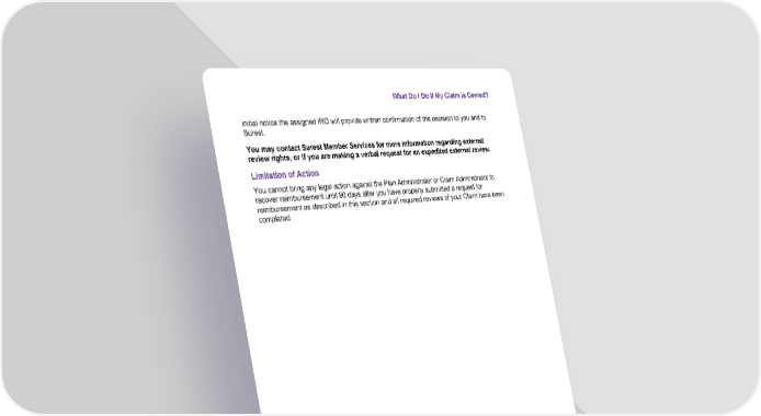 What Do I Do If My Claim Is Denied? Property of Bind Benefits, Inc., d/b/a Surest. All rights reserved © 2026. 66 initial notice the assigned IRO will provide written confirmation of the decision to you and to Surest. You may contact Surest Member Services for more information regarding external review rights, or if you are making a verbal request for an expedited external review. Limitation of Action You cannot bring any legal action against the Plan Administrator or Claim Administrator to recover reimbursement until 90 days after you have properly submitted a request for reimbursement as described in this section and all required reviews of your Claim have been completed.