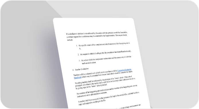 If a satisfactory solution is not achieved by discussion with the principal or with the Association, a written request for a conference may be submitted to the Superintendent. This request should include: 1. the specific nature of the complaint and a brief statement of the facts giving rise to it; 2. the respect in which it is alleged that the complainant has been affected adversely; 3. the action which the complainant wishes taken and the reasons why it is felt that such action be taken. E. Teacher Evaluation Teachers will be evaluated each school year in accordance with the Corporation Evaluation Handbook (which may be amended from time to time) which should be consulted for details. Traveling teachers shall be evaluated by the principal of the “home” school. Other school principals who observe the teacher and would like to be involved in their evaluation may do so, by giving input to the “home” school principal. No member of the bargaining unit shall evaluate another member of the bargaining unit, nor any instructional aid or administrative assistants. A teacher shall have access to his/her personnel file kept in the central office, and shall be able to copy and respond to anything in the file. F. Mileage Reimbursement for authorized travel shall be at the IRS recognized mileage reimbursement rate. G. Association Rights The Association, as the representative employees' organization, shall have the right to use school facilities for meetings and any equipment necessary for them to represent their members. The Association, as the representative employees' organization, shall have the right to post notices of activities and matters of Association concern on teacher bulletin boards, at least one (1) of which shall be provided in each building. H. Payroll Procedures