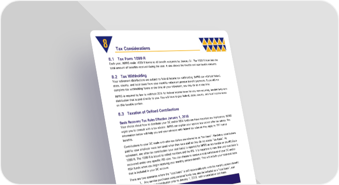 8 Tax Considerations 8.1 Tax Form 1099-R Each year, INPRS mails 1099-R forms to all benefit recipients by January 31. The 1099-R form lists the total amount of benefits received during the year. It also shows the taxable and non-taxable amounts. 8.2 Tax Withholding Your retirement distributions are subject to federal income tax withholding. INPRS can withhold federal, state, county, and local taxes from your monthly retirement pension benefit payments. If you did not complete tax withholding forms at the time of your retirement, you may do so at any time. INPRS is required by law to withhold 20% for federal income taxes for any non-recurring, taxable lump sum distribution that is paid directly to you. You will have to pay federal, state, county, and local income taxes on this taxable portion. 8.3 Taxation of Defined Contributions Basis Recovery Tax Rules Effective January 1, 2018 Your choice about how to distribute your DC and/or RSA funds can have important tax implications. INPRS urges you to consult with a tax advisor. INPRS can explain your options but cannot offer tax advice. The information below will help you and your advisors with federal tax rules as they apply to TRF Hybrid benefits. Contributions to your DC made with after-tax dollars are referred to as “tax basis”. Mandatory contributions paid by your employer were not taxed when they were paid so they do not create “tax basis”. At retirement, any after-tax contribution (your cost basis) is reported by INPRS as non-taxable on the IRS Form 1099-R. The 1099-R is issued to retired members and the IRS. It is important to note that your cost basis is recovered under very specific IRS rules. You can choose to receive a total withdrawal of your DC and/or RSA funds when you begin receiving your monthly pension benefit. This will include your total cost basis that is included in your DC account. There are two scenarios where the “cost basis” is still recoverable only with the monthly pension benefit: 1. Any service purchases using personal funds may also be included as a “cost basis”, and 2. Any vested distribution prior to January 1, 2018, with a cumulative cost basis. NOTE: INPRS only accepts rollover pre-tax contributions. Teachers' Retirement Fund Hybrid Plan Member Page 40 of 47 Handbook Effective: 07/01/2024
