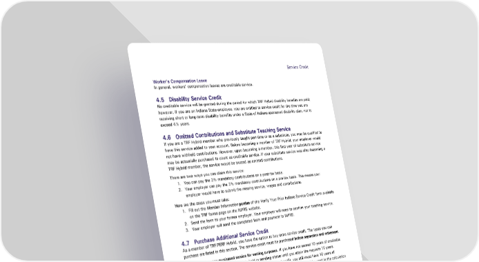 Service Credit Worker’s Compensation Leave In general, workers’ compensation leaves are creditable service. 4.5 Disability Service Credit No creditable service will be granted during the period for which TRF Hybrid disability benefits are paid; however, if you are an Indiana State employee, you are entitled to service credit for the time you are receiving short or long-term disability benefits under a State of Indiana sponsored disability plan, not to exceed 4½ years. 4.6 Omitted Contributions and Substitute Teaching Service If you are a TRF Hybrid member who previously taught part-time or as a substitute, you may be qualified to have this service added to your account. Before becoming a member of TRF Hybrid, your employer would not have withheld contributions. However, upon becoming a member, this first year of substitute service may be actuarially purchased to count as creditable service. If your substitute service was after becoming a TRF Hybrid member, the service would be treated as omitted contributions. There are two ways you can claim this service: 1. You can pay the 3% mandatory contributions on a post-tax basis. 2. Your employer can pay the 3% mandatory contributions on a pre-tax basis. This means your employer would have to submit the missing service, wages and contributions. Here are the steps you must take: 1. Fill out the Member Information portion of the Verify Your Prior Indiana Service Credit form available on the TRF forms page on the INPRS website. 2. Send the form to your former employer. Your employer will need to confirm your teaching service. 3. Your employer will send the completed form and payment to INPRS. 4.7 Purchase Additional Service Credit As a member of TRF/PERF Hybrid, you have the option to buy extra service credit. The types you can purchase are listed in this section. The service credit must be purchased before separation and retirement. You cannot use any purchased service for vesting purposes. If you have not earned 10 years of creditable service, the purchased service credit is held in pending status until you attain the requisite 10 years. Therefore, to become eligible to retire and receive a pension benefit, you still must have 10 years of creditable TRF/PERF Hybrid covered service. The additional purchased service will be used in the calculation of the pension benefit. If you end service before you qualify to retire, INPRS will refund the price you paid for the extra service. This amount will include interest. You will receive this refund if you withdraw your DC account. INPRS decides the amount based on the actuarial cost. If you take a refund or any funds for purchased service, you may return to a TRF Hybrid covered position. If you re-employ and want to purchase service, you will have to start over with the service purchase process. Basic Qualifications As an eligible active member of TRF/PERF Hybrid you can purchase 1 year of additional service credit for each 5 years of TRF/PERF Hybrid covered employment. Internal Revenue Code Section 415 purchase limits apply. To purchase service credit, you must: Teachers' Retirement Fund Hybrid Plan Member Page 19 of 47 Handbook Effective: 07/01/2024