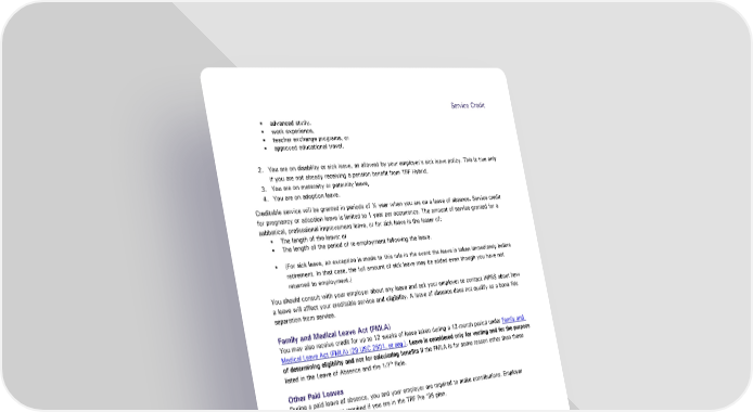 Service Credit advanced study, work experience, teacher exchange programs, or approved educational travel. 2. You are on disability or sick leave, as allowed by your employer’s sick leave policy. This is true only if you are not already receiving a pension benefit from TRF Hybrid, 3. You are on maternity or paternity leave, 4. You are on adoption leave. Creditable service will be granted in periods of ½ year when you are on a leave of absence. Service credit for pregnancy or adoption leave is limited to 1 year per occurrence. The amount of service granted for a sabbatical, professional improvement leave, or for sick leave is the lesser of: The length of the leave; or The length of the period of re-employment following the leave. (For sick leave, an exception is made to this rule in the event the leave is taken immediately before retirement. In that case, the full amount of sick leave may be added even though you have not returned to employment.) You should consult with your employer about any leave and ask your employer to contact INPRS about how a leave will affect your creditable service and eligibility. A leave of absence does not qualify as a bona fide separation from service. Family and Medical Leave Act (FMLA) You may also receive credit for up to 12 weeks of leave taken during a 12-month period under Family and Medical Leave Act (FMLA) (29 USC 2601, et seq.). Leave is considered only for vesting and for the purpose of determining eligibility and not for calculating benefits if the FMLA is for some reason other than those listed in the Leave of Absence and the 1/7th Rule. Other Paid Leaves During a paid leave of absence, you and your employer are required to make contributions. Employer contributions are not required if you are in the TRF Pre ‘96 plan. Other Granted Leaves As a member of TRF Hybrid, the following apply: • As stated in IC 20-28-10-1, a school corporation may grant a teacher a leave of absence not to exceed 1 year for the types of leaves outlined in this section. • The school corporation may grant consecutive leaves to a teacher and may grant partial compensation for a leave in the amount the school corporation determines. • The teacher has the right to return to a teaching position for which the teacher is certified or otherwise qualified under the rules of the State board. Work in a Federally Supported Educational Project In each case of a member requesting a leave of absence to work in a federally supported educational project, the Board must determine that the project is educational in nature and serves state citizens who might otherwise be served by the public schools or state educational institutions. The Board will make this determination for a 1-year period, which is later subject to review and reapproval. Teachers' Retirement Fund Hybrid Plan Member Page 18 of 47 Handbook Effective: 07/01/2024