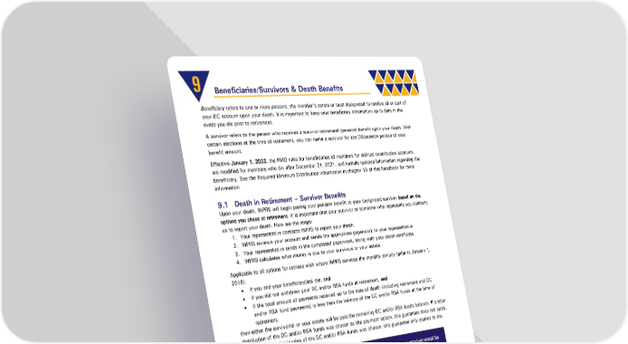 9 Beneficiaries/Survivors & Death Benefits Beneficiary refers to one or more persons, the member’s estate or trust designated to receive all or part of your DC account upon your death. It is important to keep your beneficiary information up to date in the event you die prior to retirement. A survivor refers to the person who receives a survivor retirement (pension) benefit upon your death. With certain elections at the time of retirement, you can name a survivor for the DB/pension portion of your benefit amount. Effective January 1, 2022, the RMD rules for beneficiaries of members for defined contribution accounts are modified for members who die after December 31, 2021, and include updated information regarding the beneficiary. See the Required Minimum Distribution information in chapter 10 of this handbook for more information. 9.1 Death in Retirement – Survivor Benefits Upon your death, INPRS will begin paying your pension benefit to your designated survivor based on the options you chose at retirement. It is important that your survivor or someone who represents you contacts us to report your death. Here are the steps: 1. Your representative contacts INPRS to report your death. 2. INPRS reviews your account and sends the appropriate paperwork to your representative. 3. Your representative sends in the completed paperwork, along with your death certificate. 4. INPRS calculates what money is due to your survivors or your estate. Applicable to all options for retirees with whom INPRS services the monthly annuity (prior to January 1, 2018): • If you and your beneficiary(ies) die, and • if you did not withdraw your DC and/or RSA funds at retirement, and • if the total amount of payments received up to the date of death (including retirement and DC and/or RSA fund payments) is less than the balance of the DC and/or RSA funds at the time of retirement, then either the survivor(s) or your estate will be paid the remaining DC and/or RSA funds balance. If a total distribution of the DC and/or RSA funds was chosen as the payment option, this guarantee does not apply. Also, if a partial distribution of the DC and/or RSA funds was chosen, this guarantee only applies to the remaining DC and/or RSA funds balance. NOTE: For your survivor to claim the benefit at the time of your death, your survivor must be named and on file at INPRS prior to your death. INPRS cannot accept a change of survivor after your death. 9.2 Death While Not Retired If your death occurs while you are still working or after you have separated from a TRF Hybrid covered position, and you have funds in your DC account and/or RSA, INPRS will disburse the funds based on the beneficiary information on file with INPRS. If no beneficiary is named, the funds go to your estate. Your spouse or dependent children may be entitled to your pension benefit if you die after June 30, 2018, and meet the following requirements: 1. Have at least 10 years of creditable service; and 2. Did not apply for retirement. Teachers' Retirement Fund Hybrid Plan Member Page 41 of 47 Handbook Effective: 07/01/2024