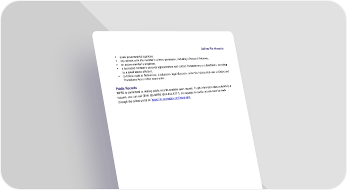Additional Plan Information quasi-governmental agencies, any person with the member's written permission, including a Power of Attorney, an active member's employer, a deceased member's personal representative with Letters Testamentary or a beneficiary, according to a small estate affidavit, to follow state or federal law, a subpoena, legal discovery under the Indiana trial rules or Orders and Procedures Act or other court order. Public Records INPRS is committed to making public records available upon request. To get information about submitting a request, you can call (844) GO-INPRS (844-464-6777). All requests for public records must be made through the online portal at: https://in.accessgov.com/inprs-apra. Teachers' Retirement Fund Hybrid Plan Member Page 47 of 47 Handbook Effective: 07/01/2024