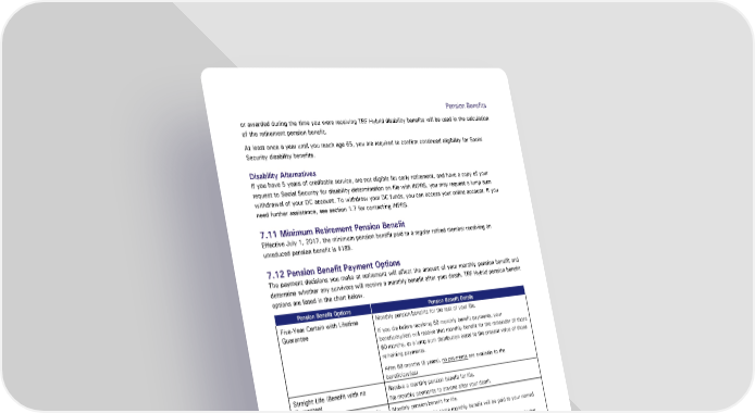 Pension Benefits or awarded during the time you were receiving TRF Hybrid disability benefits will be used in the calculation of the retirement pension benefit. At least once a year until you reach age 65, you are required to confirm continued eligibility for Social Security disability benefits. Disability Alternatives If you have 5 years of creditable service, are not eligible for early retirement, and have a copy of your request to Social Security for disability determination on file with INPRS, you may request a lump sum withdrawal of your DC account. To withdraw your DC funds, you can access your online account. If you need further assistance, see section 1.7 for contacting INPRS. 7.11 Minimum Retirement Pension Benefit Effective July 1, 2017, the minimum pension benefit paid to a regular retired member receiving an unreduced pension benefit is $185. 7.12 Pension Benefit Payment Options The payment decisions you make at retirement will affect the amount of your monthly pension benefit and determine whether any survivors will receive a monthly benefit after your death. TRF Hybrid pension benefit options are listed in the chart below. Pension Benefit Options Pension Benefit Details Five-Year Certain with Lifetime Monthly pension benefits for the rest of your life. Guarantee If you die before receiving 60 monthly benefit payments, your beneficiary(ies) will receive that monthly benefit for the remainder of those 60 months, or a lump sum distribution equal to the present value of those remaining payments. re available to the After 60 months (5 years), no payments a beneficiary(ies). Straight Life (Benefit with no Receive a monthly pension benefit for life. Guarantee) No monthly payments to anyone after your death. Joint with 100% Survivor Benefit Monthly pension benefit for life. After your death, the same monthly benefit will be paid to your named survivor for the survivor’s lifetime. You will need to contact INPRS if your survivor/beneficiary is not your spouse. There are restrictions (age, child, etc.) and only one survivor can be named. Joint with 66⅔% Survivor Benefit Monthly pension benefit for life. After your death, two-thirds (66⅔ percent) of the monthly benefit will be paid to your named survivor for the survivor’s lifetime. You will need to contact INPRS if your survivor/beneficiary is not your spouse. There are restrictions (age, child, etc.) and only one survivor can be named. Teachers' Retirement Fund Hybrid Plan Member Page 35 of 47 Handbook Effective: 07/01/2024