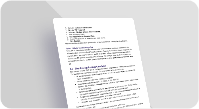 1. Go to the Application and Calculators 2. Click the TRF Pension tab 3. Select the Calculator Estimate Retirement Benefit. 4. Enter a retirement date. 5. Click Apply Projected Retirement Date. 6. Answer the questions on beneficiary and social security. 7. Click Calculate. The results will be an estimate of your monthly pension benefit broken down by the selected options. Option 2 (Social Security Integration) Using one of the available calculator features or the worksheet above, calculate an estimate with the information from your latest Social Security statement. To qualify for this Social Security Integration (SSI) payment option, you must be less than age 62 at retirement and you must enter your estimated Social Security monthly payment amount that Social Security shows for you at age 62. Depending upon your estimated Social Security payment, pension benefit payments will be greatly reduced or terminated at age 62. 7.5 Final Average Earnings Calculation Final average earnings (FAE) refer to the highest 5 years of compensation in a TRF Hybrid covered position. The 5 years do not have to be continuous. The items included in this calculation are: All your compensation reported as gross income on a W-2 for covered employment in a TRF/PERF Hybrid covered position. Pre-tax contributions paid to the Fund by your employer. Amounts deferred under sections 125, 403(b), or 457 of the IRC. Amounts that would have been paid when you were on an unpaid leave of absence while serving in an elected position. Compensation paid in contemplation of your retirement (severance pay), up to $2,000, including any employer-paid mandatory contributions paid before you cease employment. Compensation paid as part of a legal settlement or for back-pay that will be allocated to the year in which the compensation was earned or would have been earned. Differential wage payments if you were on active military duty on or after January 1, 2009. Compensation from multiple employers is totaled if you receive annual compensation from two or more participating employers and: You and each employer made all required contributions to the Fund. You served in at least one position that normally required more than 600 hours of service during the year. 7.6 Regular Retirement without Employer Separation (Active, In Service) If you are a TRF Hybrid member no longer working in a TRF/PERF Hybrid covered position but still actively working with the same employer in a non PERF/TRF Hybrid covered position, you may be eligible to retire from TRF/PERF Hybrid and begin receiving a pension benefit if you are otherwise eligible for retirement and have reached normal retirement age. The in-service retirement age is the same as the regular retirement ages for all plans employing the Rule of 85 (35 IAC 1.2-1-4). See section 7.1 for more details. Teachers' Retirement Fund Hybrid Plan Member Page 31 of 47 Handbook Effective: 07/01/2024