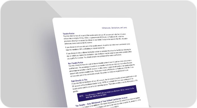 WWiitthdhdrraawwaallss, , DDiissttrriibutbutiionsons, a, and Lnd Looaansns Taxable Portion You may elect to have all or part of the taxable portion of your DC account paid in the form of a direct rollover into an eligible 401(a), 403(b), or governmental 457(b) plan, or Traditional IRA, which has provisions allowing it to accept the rollover on your behalf. Except in the case of a Roth IRA, this option defers any taxes owed on the DC balance. If you choose to roll over only part of the taxable amount, the portion not rolled over is paid directly to you (less the mandatory 20% withholding for federal income tax). If you choose to take a rollover distribution and do not complete the rollover by the 60th day following the day on which you receive the distribution, your distribution may be subject to taxes and/or penalties unless you qualify for a waiver. You should consult a tax professional for waiver qualifications. Non-Taxable Portion You may choose to have all or part of the non-taxable portion of your DC paid as a direct rollover into a qualified plan. The percentage of taxable to non-taxable funds that are rolled over must reflect the same percentage as currently in the DC account. In other words, it cannot be all taxable or non-taxable unless the account only contains taxable funds. Those plans include a 403(b) plan, or Traditional or Roth IRA. If you roll over only part of the non-taxable amount, the portion not rolled over is paid directly to you. Paid Directly to You If you take the full distribution of your DC account, the full amount of taxable and non-taxable funds in your DC account will be distributed directly to you. INPRS will withhold 20% from your withdrawal of the taxable portion paid to you or to your surviving spouse. This is done whether or not the IRS imposes a 10% penalty. NOTE: You will receive a 1099-R after you receive your distribution. By law, January 31 is the latest date 1099-Rs can be mailed. Tax Penalty – Early Withdrawal of Your Defined Contribution Account You may be subject to an additional 10% federal tax penalty on your DC account if you have not reached the age of 59½ at the time of distribution and you do not meet any other exception. By January 31, of the year after you receive your distribution, you will receive a 1099-R. Teachers' Retirement Fund Hybrid Plan Member Page 28 of 47 Handbook Effective: 07/01/2024