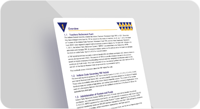 1 Overview 1.1 Teachers Retirement Fund The Indiana General Assembly created the Indiana Teachers’ Retirement Fund (TRF) in 1921. Since then, they have changed some laws for TRF to respond to the needs of members. As of July 1, 2010, the Board of Trustees of the Indiana State Teachers’ Retirement Fund (TRF) and the Public Employees’ Retirement Fund (PERF) were required to appoint and compensate a common director for TRF and PERF. Effective July 1, 2011, the Indiana Public Retirement System (“INPRS”) was established under Indiana law. INPRS administers and manages TRF. An executive director carries out the policies set by the board and manages the fund on a daily basis. See IC 5-10.5 for more information. A TRF Hybrid benefit has two parts: a defined benefit (DB) and defined contribution (DC, formerly known as annuity savings account [ASA]). The purpose of TRF is to provide retirement income for the exclusive benefit of eligible employees of participating employers and their designated beneficiaries subject to the conditions set forth herein. This Fund is intended to be a tax-exempt qualified trust under sections 401(a) and 501 of the Internal Revenue Code as sponsored by a governmental agency. This handbook covers information about the TRF Hybrid Plan only. 1.2 Indiana Code Governing TRF Hybrid The laws and regulations governing TRF Hybrid may be found in IC 5-10.2, IC 5-10.4, IC 5-10.5, 35 IAC, and Internal Revenue Code Section 401, as well as specific resolutions adopted by the Board of Trustees. These codes are available online at the Indiana General Assembly website. The content of this member handbook does not constitute legal advice, and nothing herein should be considered a legal opinion. In the event of a discrepancy between information in this handbook and the laws of the State of Indiana, the applicable laws shall apply. 1.3 Administration of System and Funds Indiana Public Retirement System (INPRS) administers 16 funds (eight defined benefit, five defined contribution, two other post-employment benefit, and one custodial). In accordance with Indiana Code (IC) 5-10.5-2-3, INPRS is governed by a nine-member Board of Trustees, appointed by the Governor. INPRS combined membership totals over 500,000 members representing more than 1,250 participating employers including public universities, school corporations, municipalities, and State agencies. For a listing of all funds and additional information about each fund, visit the Annual Reports page of the INPRS website. 1.4 Board of Trustees INPRS is governed by a nine-member Board of Trustees, appointed by the Governor. Board members serve as “fiduciaries” of the Fund, which means they are legally bound to make investment decisions with your best interest in mind. The executive director carries out the policies set by the Board and administers the Fund (IC 5-10.5). 1.5 INPRS Vision, Mission, and Values Mission: Engaged members able to realize their retirement dreams. Vision: As fiduciaries, educate stakeholders, collect necessary contributions, and prudently manage member assets to deliver promised DB and DC benefits and services. Teachers' Retirement Fund Hybrid Plan Member Page 5 of 47 Handbook Effective: 07/01/2024