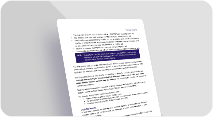 Pension Benefits You must have at least 5 years of service credit in a TRF/PERF Hybrid covered position; and Your disability must occur while employed in a PERF/TRF Hybrid covered position; and Your disability must be confirmed by the SSA, and you are receiving salary, worker’s compensation benefits, or employer-provided income protection benefits (for example, long-term disability), or are on leave under FMLA as of the onset date established by the SSA; and You may be receiving disability insurance payments from your employer; and Your disability benefit calculation will only use the service credit accrued prior to your onset date. NOTE: To qualify for a disability benefit from TRF Hybrid, you must have an employment relationship with your TRF Hybrid employer in a TRF Hybrid-covered position as of the onset date of the Social Security disability. You must provide proof you qualify for a Social Security disability. You can apply for disability retirement while waiting to receive an award letter from the SSA. In such a situation you must provide a copy of the application you sent to the SSA when completing the online retirement application for disability. The SSA will decide on an onset date for your disability. To qualify for a disability pension benefit, your onset date must be during the time you worked in a TRF-covered position, were on FMLA leave, or were getting disability insurance payments from your employer. You can also qualify if on that date you were on workers’ compensation. Disability retirement requires the completion of at least 5 years of creditable service and qualification for disability benefits by Social Security Administration (SSA) and approval from the INPRS. The disability pension benefit commencement date is either: The month following Social Security disability onset. The later of onset or last day of pay, dependent upon your age and service at time of disability. The onset date must be within 30 days from last check date. Disability Benefits At least once a year until you reach age 65 or becoming eligible for an unreduced normal TRF Hybrid retirement based on age and total service, you are required to confirm continued eligibility for Social Security disability benefits. Disability retirement options and calculations for the monthly pension benefit and the DC (including rolled over funds) are the same as those for any other retiree with the exceptions that: 1. You cannot choose the Social Security Integration option, 2. Generally, you will only get service credit for your work up to the onset date of your disability, 3. Your monthly pension benefit will not be reduced for early retirement, and 4. You will not be paid any less than $185 each month with the 5-Year Certain and Lifetime Benefit option or the actuarial equivalent with any other benefit election. No creditable service will be granted during the period for which a disability benefit is paid. Switch From Disability Retirement to Regular Retirement If you are receiving a disability retirement it will be automatically converted to a regular retirement pension benefit upon reaching age and service eligibility. Unless otherwise prohibited by law, service credit earned Teachers' Retirement Fund Hybrid Plan Member Page 34 of 47 Handbook Effective: 07/01/2024