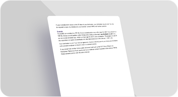 If your re-employment occurs within 30 days of your distribution, your distribution may be void. You may be required to repay any distributions you received. Contact INPRS with further questions. Example You qualify to re-employ in a TRF My Choice-covered position on or after June 18, 2021. If you return to a TRF My Choice-covered position within 30-days after ending employment, your distribution is void if you are not normal retirement age, which is at least age 62 with 5 years participation. This exception to the 30- day separation rule applies to individuals who take distributions on or after January 1, 2021, only. Your distribution is void if you have an agreement, formal or informal, prior to your taking your distribution, with a covered employer to return to work in a covered position. If you retired from another Indiana public retirement fund (such as the 1977 Police Officers’ and Firefighters’ Retirement Fund) you do not have a minimum period of separation before taking a TRF My Choice-covered position with the same employer. TRF My Choice: Retirement Savings Plan Member Page 23 of 30 Handbook Effective: 07/01/2024