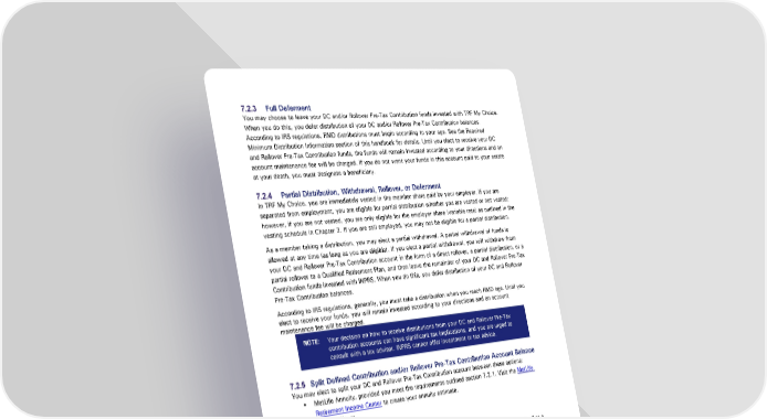 7.2.3 Full Deferment You may choose to leave your DC and/or Rollover Pre-Tax Contribution funds invested with TRF My Choice. When you do this, you defer distribution of your DC and/or Rollover Pre-Tax Contribution balances. According to IRS regulations, RMD distributions must begin according to your age. See the Required Minimum Distribution Information section of this handbook for details. Until you elect to receive your DC and Rollover Pre-Tax Contribution funds, the funds will remain invested according to your directions and an account maintenance fee will be charged. If you do not want your funds in this account paid to your estate at your death, you must designate a beneficiary. 7.2.4 Partial Distribution, Withdrawal, Rollover, or Deferment In TRF My Choice, you are immediately vested in the member share paid by your employer. If you are separated from employment, you are eligible for partial distribution whether you are vested or not vested; however, if you are not vested, you are only eligible for the employer share (variable rate) as outlined in the vesting schedule in Chapter 3. If you are still employed, you may not be eligible for a partial distribution. As a member taking a distribution, you may elect a partial withdrawal. A partial withdrawal of funds is allowed at any time (as long as you are eligible). If you elect a partial withdrawal, you will withdraw from your DC and Rollover Pre-Tax Contribution account in the form of a direct rollover, a partial distribution, or a partial rollover to a Qualified Retirement Plan, and then leave the remainder of your DC and Rollover Pre-Tax Contribution funds invested with INPRS. When you do this, you defer distribution of your DC and Rollover Pre-Tax Contribution balances. According to IRS regulations, generally, you must take a distribution when you reach RMD age. Until you elect to receive your funds, you will remain invested according to your directions and an account maintenance fee will be charged. NOTE: Your decision on how to receive distributions from your DC and Rollover Pre-Tax contribution accounts can have significant tax implications, and you are urged to consult with a tax advisor. INPRS cannot offer investment or tax advice. 7.2.5 Split Defined Contribution and/or Rollover Pre-Tax Contribution Account Balance You may elect to split your DC and Rollover Pre-Tax Contribution account between these options: MetLife Annuity, provided you meet the requirements outlined section 7.2.1. Visit the MetLife Retirement Income Center to create your annuity estimate. Direct Rollover Lump Sum Defer You must complete your IRA or Qualified Retirement Plan information if you choose to roll over all or a portion of your DC and Rollover Pre-Tax Contribution accounts. 7.3 Direct Deposit Direct deposit is the required method to distribute benefit payments. You can complete and submit the Direct Deposit form from your online account. You can update your direct deposit information online at any time. 7.4 Re-Employment of Vested Members (Who Select Distribution) You can go back to work after you take distribution of your DC and/or Rollover Pre-Tax Contribution funds. If you re-employ with a new employer or the same employer, you will return to the TRF My Choice Plan. TRF My Choice: Retirement Savings Plan Member Page 22 of 30 Handbook Effective: 07/01/2024