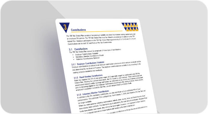 3 Contributions The TRF My Choice Plan consists of an employer variable rate share that includes vesting requirements and an employee 3% portion. The TRF My Choice Plan must be offered by an employer in addition to the TRF Hybrid Plan. Employer participation in the TRF My Choice Plan is governed by IC 5-10.4-8 and IC 5-10.4-9. Contributions can be both DC and Rollover Pre-Tax Contributions. 3.1 Contributions The TRF My Choice Plan account is comprised of three types of contributions: Employer Contributions (Variable) Mandatory Member Contributions (Fixed) Voluntary Contributions (Optional) 3.1.1 Employer Contributions (Variable) Employer contributions are placed in an employer contribution subaccount which receives an annual variable rate determined by the Board of Trustees. The employer contributions are available to you according to the vesting schedule detailed in this handbook. 3.1.2 Fixed Member Contributions State law requires that 3% of your gross wages (W-2 reportable wages) be contributed to the TRF My Choice Plan. Working for a school corporation, the 3% is paid by your employer. These contributions and accumulated interest credits (earnings and losses) are refundable to you should you terminate employment prior to becoming eligible for the Employer Contributions according to the vesting schedule. While actively employed in a position covered by the Plan, you are not permitted to withdraw funds. 3.1.3 Voluntary Member Contributions In addition to the 3% mandatory contribution, you may contribute up to an additional 10% of your compensation. This additional 10% is all post-tax. As of January 1, 2018, the Voluntary Pre-Tax Plan was no longer available. When you make post-tax voluntary contributions, federal, state, county, local, and Social Security taxes have already been withheld. The take-home pay is reduced by the total amount contributed. Because these funds have already been taxed, they will not be taxed again; however, it is important to know that any earnings or interest accrued on these funds is still taxable at the time of distribution. You may choose to stop making post-tax voluntary contributions or change the amount deducted at any time. 3.2 Internal Revenue Code 401(a) 17 Limits As a member of TRF My Choice you are subject to the annual compensation limit under Sections 401(a)(17), 404(l), 408(k)(3)(C), and 408(k)(6)(D)(ii) of the IRC. These limits are subject to change on an annual basis. To find out if your annual compensation meets the limit under the IRC, please visit Internal Revenue System’s website at www.irs.gov. 3.3 Rollover Funds into TRF My Choice You may create a Rollover Pre-Tax Contribution account in TRF My Choice with funds rolled over from any of the following: A qualified plan described in IRS Section 401(a), 403(a) or an annuity contract or account described in Section 403(b) TRF My Choice: Retirement Savings Plan Member Page 10 of 30 Handbook Effective: 07/01/2024