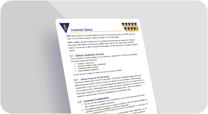 5 Investment Options INPRS offers a variety of investment options from which you can choose to invest your TRF My Choice DC funds. Your DC funds are subject to market risk when your funds are invested. INPRS is unable to provide investment advice. Investment fund performance fact sheets with information about each of the funds in this section are available on the Investment Fact Sheets page of the INPRS website. You may want to talk to a trusted financial advisor or review the Investing 101 page on the INPRS website. 5.1 Defined Contribution Account Your DC account is money set aside for you to use after you separate from TRF My Choice employment. The funds in this account come from: mandatory contributions voluntary contributions (pre- and post-tax) investment profits and losses vested employer contributions Your DC account is subject to market risk when your funds are invested. 5.1.1 Rollover Funds into TRF My Choice If you have a rollover account with TRF Hybrid and/or TRF My Choice: Retirement Savings, INPRS must keep the accounts separate. The funds are shown as Rollover Pre-Tax Contribution or Rollover Savings Account (RSA) in your account. You may have separate investment elections for your DC and Rollover Pre- Tax Contribution funds. Initial elections can be made on the rollover contribution form. The Rollover Pre-Tax Contribution funds may be invested in any of the current investment options. The amount selected for investment must be at least 1% of your total balance and you can change it daily. 5.2 Investment Considerations 1. You can view daily valuations of your DC and Rollover Pre-Tax Contribution accounts and make daily changes to your investment allocations. 2. The investment direction can cover your current DC and Rollover Pre-Tax Contribution balance, as applicable, and all future contributions or just future contributions. 3. If you are newly enrolled in TRF My Choice, your funds will be invested only in a Target Date Fund until you select other options. 4. If you return to a TRF My Choice-covered position after having a break in employment, you will have the same investment elections as when you left, regardless of whether you elected to withdraw your DC and Rollover Pre-Tax Contribution accounts, as applicable. 5.3 Investment Options Upon enrollment in TRF My Choice, you are enrolled in the Target Date Fund (default) based on your projected retirement date. Your DC will continue with this investment option until you make other investment elections. You can view or change your investment options by logging in to your online account or contacting INPRS. Several investment options are available from which you may choose. TRF My Choice: Retirement Savings Plan allows you to manage your DC account and Rollover Pre-Tax Contribution account, as applicable, with self-directed investment options. You may decide how to invest the contributions posted to your account and choose any one or more of the 8 funds available: Fixed Income Fund TRF My Choice: Retirement Savings Plan Member Page 15 of 30 Handbook Effective: 07/01/2024