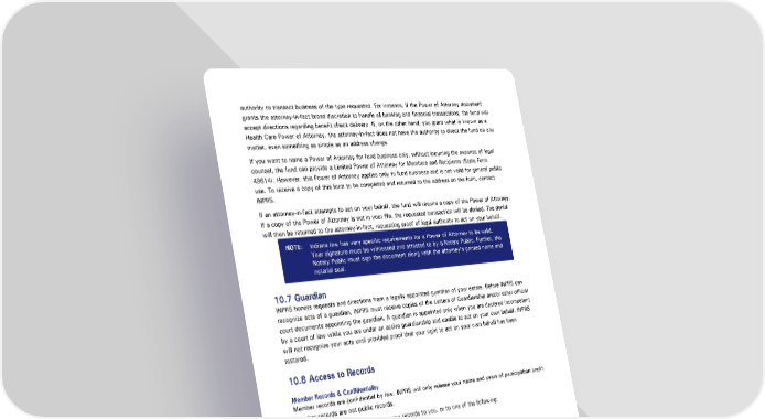 authority to transact business of the type requested. For instance, if the Power of Attorney document grants the attorney-in-fact broad discretion to handle all banking and financial transactions, the fund will accept directions regarding benefit check delivery. If, on the other hand, you grant what is known as a Health Care Power of Attorney, the attorney-in-fact does not have the authority to direct the fund on any matter, even something as simple as an address change. If you want to name a Power of Attorney for fund business only, without incurring the expense of legal counsel, the fund can provide a Limited Power of Attorney for Members and Recipients (State Form 49614). However, this Power of Attorney applies only to fund business and is not valid for general public use. To receive a copy of this form to be completed and returned to the address on the form, contact INPRS. If an attorney-in-fact attempts to act on your behalf, the fund will require a copy of the Power of Attorney. If a copy of the Power of Attorney is not in your file, the requested transaction will be denied. The denial will then be returned to the attorney-in-fact, requesting proof of legal authority to act on your behalf. NOTE: Indiana law has very specific requirements for a Power of Attorney to be valid. Your signature must be witnessed and attested to by a Notary Public. Further, the Notary Public must sign the document along with the attorney’s printed name and notarial seal. 10.7 Guardian INPRS honors requests and directions from a legally appointed guardian of your estate. Before INPRS can recognize acts of a guardian, INPRS must receive copies of the Letters of Guardianship and/or other official court documents appointing the guardian. A guardian is appointed only when you are declared incompetent by a court of law while you are under an active guardianship and unable to act on your own behalf. INPRS will not recognize your acts until provided proof that your right to act on your own behalf has been restored. 10.8 Access to Records Member Records & Confidentiality Member records are confidential by law. INPRS will only release your name and years of participation credit. Member records are not public records. INPRS can provide information from your records to you, or to one of the following: a guardian, a representative of your estate, an attorney-in-fact (aka Power of Attorney or POA), someone to whom you have given express permission, or someone named by a court order. Indiana law, 35 IAC 1.2-1-5 and IC 5-10.5-6-4, outlines INPRS confidentiality rules and allows INPRS, at its discretion, to provide member information to: members of the Indiana General Assembly, state agencies, quasi-governmental agencies, any person with the member's written permission, including a Power of Attorney, an active member's employer, TRF My Choice: Retirement Savings Plan Member Page 29 of 30 Handbook Effective: 07/01/2024