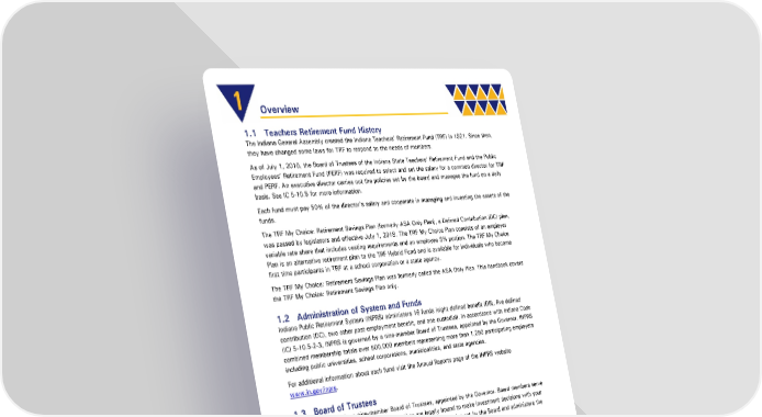 1 Overview 1.1 Teachers Retirement Fund History The Indiana General Assembly created the Indiana Teachers’ Retirement Fund (TRF) in 1921. Since then, they have changed some laws for TRF to respond to the needs of members. As of July 1, 2010, the Board of Trustees of the Indiana State Teachers’ Retirement Fund and the Public Employees’ Retirement Fund (PERF) was required to select and set the salary for a common director for TRF and PERF. An executive director carries out the policies set by the board and manages the fund on a daily basis. See IC 5-10.5 for more information. Each fund must pay 50% of the director’s salary and cooperate in managing and investing the assets of the funds. The TRF My Choice: Retirement Savings Plan (formerly ASA Only Plan), a Defined Contribution (DC) plan, was passed by legislators and effective July 1, 2019. The TRF My Choice Plan consists of an employer variable rate share that includes vesting requirements and an employee 3% portion. The TRF My Choice Plan is an alternative retirement plan to the TRF Hybrid Fund and is available for individuals who become first time participants in TRF at a school corporation or a state agency. The TRF My Choice: Retirement Savings Plan was formerly called the ASA Only Plan. This handbook covers the TRF My Choice: Retirement Savings Plan only. 1.2 Administration of System and Funds Indiana Public Retirement System (INPRS) administers 16 funds (eight defined benefit (DB), five defined contribution (DC), two other post-employment benefit, and one custodial). In accordance with Indiana Code (IC) 5-10.5-2-3, INPRS is governed by a nine-member Board of Trustees, appointed by the Governor. INPRS combined membership totals over 500,000 members representing more than 1,250 participating employers including public universities, school corporations, municipalities, and state agencies. For additional information about each fund visit the Annual Reports page of the INPRS website . www.in.gov/inprs 1.3 Board of Trustees INPRS is governed by a nine-member Board of Trustees, appointed by the Governor. Board members serve as “fiduciaries” of the Fund, which means they are legally bound to make investment decisions with your best interest in mind. The executive director carries out the policies set by the Board and administers the Fund (IC 5-10.5). 1.4 INPRS Vision, Mission, and Values Mission: Engaged members able to realize their retirement dreams Vision: As fiduciaries, educate stakeholders, collect necessary contributions, and prudently manage member assets to deliver promised DB and DC benefits and services. Values: INPRS believes people are the foundation of our success. It takes people with different backgrounds, ideas, and strengths to be successful. Success is built upon accountability, commitment, constructive conflict, and trust. TRF My Choice: Retirement Savings Plan Member Page 4 of 30 Handbook Effective: 07/01/2024