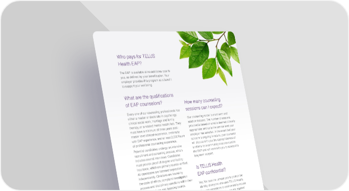 Who pays for TELUS Health EAP? The EAP is available at no additional cost to you, as defined by your benefits plan. Your employer provides this program as a benefit to support your wellbeing. What are the qualifications of EAP counselors? Every one of our counseling professionals has either a master or doctorate in psychology, clinical social work, marriage and family therapy, or a related mental health field. They must have a minimum of three years post- master level clinical experience, preferably with EAP experience, and at least 2,500 hours of professional counseling experience. Potential candidates undergo an intensive recruitment and screening process, which includes several interviews. Candidates must provide proof of degree and liability insurance, which are primary source verified. All candidates are licensed to practice independently. Clinicians are bound by the code of ethics, complaint investigation process and disciplinary sanctions within their own associations and licensing boards. Minimum requirements are: ∙ Master’s-level education, typically in social work, counseling psychology, marriage and family therapy or related mental healthcare program ∙ Three years of post-master’s level clinical experience ∙ Successful completion of an intensive screening process with reference checks ∙ Ongoing proof of active liability insurance ∙ Licensed to practice independently How many counseling sessions can I expect? Our counseling model is short-term and solution-focused. The number of sessions provided is based on what is deemed clinically appropriate, and up to the service level your employer has selected. In the event that your concern is ongoing in nature, your counselor will discuss with you the appropriateness of a referral to a community resource outside the EAP and will work with you to access this long-term support. Is TELUS Health EAP confidential? Yes. We take the utmost care to protect the identity of anyone who uses TELUS Health. The only exceptions to confidentiality include those governed by law, i.e., we are required to release documents under court subpoena, and we have a duty to intervene and report if a consultant or counselor deems an individual to be at imminent risk of harm to self or others.