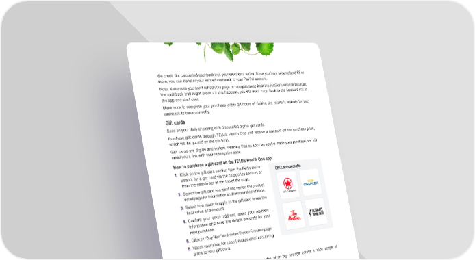 THS5509-04-2024-V5 We credit the calculated cashback into your electronic wallet. Once you have accumulated $5 or more, you can transfer your earned cashback to your PayPal account. Note: Make sure you don't refresh the page or navigate away from the retailer’s website because the cashback trail might break - if this happens, you will need to go back to the selected link in the app and start over. Make sure to complete your purchase within 24 hours of visiting the retailer’s website for your cashback to track correctly. Gift cards Save on your daily shopping with discounted digital gift cards. Purchase gift cards through TELUS Health One and receive a discount off the purchase price, which will be quoted on the platform. Gift cards are digital and instant meaning that as soon as you've made your purchase, we will email you a link with your redemption code. How to purchase a gift card on the TELUS Health One app: 1. Click on the gift card section from the Perks menu. Search for a gift card via the categories section, or from the search bar at the top of the page. 2. Select the gift card you want and review the product detail page for information and terms and conditions. 3. Select how much to apply to the gift card to see the final value and amount. 4. Confirm your email address, enter your payment information and save the details securely for your next purchase. 5. Click on "Buy Now" and review the confirmation page. 6. Watch your inbox for a confirmation email containing a link to your gift card. Exclusive offers TELUS Health exclusive online voucher codes offer big savings across a wide range of everyday spending. • Click the offer that interests you • Click the “Get Deal” button to redirect to the merchant's website. Some offers might include a promo code to use once redirected to their website to redeem the offer Gift Cards include: Offers include: Start saving today
