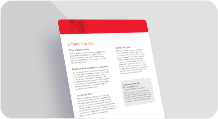 Enhance Your Plan Waiver of Premium Rider Children’s Term Rider This rider waives the premium if the base insured becomes This rider provides Term Life Insurance protection totally disabled, as defined in the rider, for at least six for all eligible children between the ages of one consecutive months. Premiums are waived for the base month through 19 (in MI and PA, age 17; MA and WA, policy and any attached riders. The issue age is 17-60. The age 14). Three benefit levels are available: $10,000, rider terminates at age 65. $20,000, and $30,000 ($15,000 in WA). Coverage remains on each child until age 26 or the child’s Accidental Death and Dismemberment Rider marriage before age 26. Your covered child may also convert this rider for up to five times the amount of This rider provides coverage upon death, dismemberment, coverage (subject to a $100,000 limit) to any form of or paralysis of the base insured before age 70 if such death, permanent insurance offered by American Fidelity. dismemberment, or paralysis results from accidental One premium covers all eligible children. causes, as defined in the rider. This rider also provides an additional 10% seat belt benefit if the police accident report certifies the base insured was wearing a properly fastened seat belt at the time of death. Benefits are payable once per covered accident. Accelerated Benefit Rider Spouse Term Rider for Long Term Illness (Available with 30-Year Term Life Only) This rider provides Term Life Insurance coverage for This rider provides for two equal advances of a your spouse. The premiums for this rider are based on portion of the base policy’s death benefit due to the spouse’s age and tobacco usage. Coverage may be a Long Term Illness if we receive satisfactory proof renewed for each additional renewal period up to the of Long Term Illness before each annual payment. spouse’s age of 90 while the base policy is active. Premiums Coverage is available on the base insured only. are guaranteed to remain the same during the initial term 7 period. Premiums adjust upon renewal. The face amount must be equal to or less than the base policy. Social Security numbers are required at the time of application for spouses and dependents. Additional riders are subject to our general underwriting criteria, and coverage is not guaranteed. Rider availability may vary by state. Third Party Notice: The owner has the right to designate a third party to receive notice of lapse or termination of an individual life insurance policy due to nonpayment of premium. Such notice will be sent to the policy owner and the third party at least 30 calendar days before cancellation. This designation may be done at this time or at any time the policy is in force. Please contact us to request a form to designate, change or update this information at a later date. M3437.R118 For Illinois Applicants: We will treat a party to a civil union and a spouse in a marriage equally in our policies that are governed by your state. We will include a party to a civil union in any definition or use of the terms “spouse,” “family,” “immediate family,” “dependent,” “next of kin,” and any other terms descriptive of spousal relationships in our policies. Any policies providing coverage for children will extend eligibility for coverage to children of civil unions. DN88.R0916 MARYLAND DISCLAIMER: A PERSON WHO FELONIOUSLY AND INTENTIONALLY KILLS, CONSPIRES TO KILL OR PROCURES THE KILLING OF THE INSURED AND WHO IS A NAMED BENEFICIARY OF A LIFE INSURANCE POLICY ON THE INSURED IS NOT ENTITLED TO A BENEFIT UNDER THE POLICY. DN137