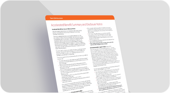Accelerated Benefit Summary and Disclosure Notice AF-2229(Education)-0523 051-536, 051-537, 051-546, 051-547, 051-556, 051-557 Accelerated Benefit Summary and Disclosure Notice THIS DOCUMENT SERVES ONLY AS A SUMMARY AND A DISCLOSURE NOTICE. PLEASE REFER TO YOUR POLICY OR RIDER FOR ACTUAL CONTRACT PROVISIONS. THE POLICY/RIDER PROVIDES AN ACCELERATED BENEFIT OPTION. YOU SHOULD CONSULT WITH A PERSONAL TAX ADVISOR IF YOU ARE CONSIDERING ELECTING PAYMENT UNDER AN ACCELERATED BENEFIT PROVISION. BENEFITS AS SPECIFIED IN THE POLICY/RIDER WILL BE REDUCED UPON RECEIPT OF AN ACCELERATED BENEFIT PAYMENT. RECEIPT OF ACCELERATED BENEFIT PAYMENTS: 1) MAY BE TAXABLE; 2) MAY AFFECT YOUR ELIGIBILITY FOR BENEFITS UNDER STATE OR FEDERAL LAW; AND, 3) DO NOT AND ARE NOT INTENDED TO QUALIFY AS LONG- TERM CARE INSURANCE. The policy and/or rider you are applying for has an Accelerated Benefit provision. The provision allows a portion of the death benefits to be advanced if certain conditions are met. Please see policy/rider for conditions and definitions, as applicable. Prior to the payment of any Accelerated Benefit, the following conditions must be met: • The maximums vary by policy/rider (see specific information below) and shall not exceed the Benefit Amount for the policy shown on the Policy Schedule. • Only one Accelerated Benefit election will be made under the policy and/or each rider even if the Owner does not elect the full acceleration amount. • If two or more Accelerated Benefits are payable on behalf of the Insured/Covered Person under the policy or any attached riders for the same or related sickness, injury or loss, benefits will be paid in the following order: 1) Accelerated Benefit for Long Term Illness, if this optional rider is attached to the policy; and 2) Accelerated Benefit for Terminal Condition. • Additional limitations and exclusions may apply, please read your policy/rider carefully. Upon request to accelerate the policy/rider proceeds, and upon the payment of the accelerated benefit, the Owner and any irrevocable beneficiary shall be given a statement demonstrating the effect of the acceleration on the payment of policy proceeds, cash value, death benefit, premium, and policy loans, as applicable. Accelerated Benefit for Terminal Condition Prior to the payment of any Accelerated Benefit, the Insured/Covered Person must have a Terminal Condition, defined as an imminent death expected as a result of a non-correctable medical condition that with reasonable medical certainty will result in a drastically limited life span of the Insured/Covered Person of 12 months or less. The maximum payable is the lesser of: 50% of the eligible proceeds as defined in the policy/rider, or $100,000. There is no premium associated with this provision. Payment of an Accelerated Benefit, if elected, will have the following effect on your contract: • Upon payment of the Accelerated Benefit, the policy/rider will remain in force. Any premiums due to keep the policy/rider in force will be paid by us, and will be deducted from the policy proceeds upon death, unless you are currently exercising the Automatic Premium Loan option. If you are currently exercising the Automatic Premium Loan option, any premiums will continue to be paid under this option, until such time as this option is exhausted or discontinued. • Policy proceeds which are payable on the death of the Insured/ Covered Person will be reduced by the amount of the Accelerated Benefit, any outstanding policy loans, and any premiums paid by us on your behalf. • Cash values, if any, will continue to accumulate as specified in your policy or rider. Access to the policy cash value may be restricted to the excess of the cash value over the sum of the amount accelerated and any premiums paid by us and any other outstanding policy loans. • Any outstanding loan, including interest will not be deducted from the Accelerated Benefit payment. • This Accelerated Benefit will be treated as a lien against the death benefit and applied at time of death. Accelerated Benefit for Long Term Illness (optional rider) Prior to the payment of any Accelerated Benefit, the Insured must have a Long Term Illness, which means the Insured has been certified within the last 12 months by a Licensed Health Care Practitioner as permanently unable to perform, without Substantial Assistance from another individual, at least two out of five Activities of Daily Living for a period of at least 90 days due to a loss of functional capacity; or requiring Substantial Supervision due to permanent Severe Cognitive Impairment. The maximum payable is the lesser of 50% of the Eligible Proceeds available at the time of claim payable in two equal annual payments up to a maximum of 25% of the Eligible Proceeds per year for two consecutive years; or $100,000 payable in two equal annual payments up to a maximum of $50,000 per year for two consecutive years. Premium is required to keep this rider in force. Payment of an Accelerated Benefit for Long Term Illness, if elected, will have the following effect on your contract: • Upon payment of the Accelerated Benefit, the rider will terminate and no additional benefits will be due under the rider, even for recurrence. The policy will remain in force and premiums will continue to be billed and payable as due. • Policy proceeds which are payable on the death of the Insured will be reduced by the amount of the Accelerated Benefit. • Cash values, if any, will continue to accumulate as specified in your policy or rider. The cash values will be adjusted proportionally by the percent accelerated. • Any outstanding policy loan, including interest, will be proportionally reduced by the percent accelerated and will be deducted from the Accelerated Benefit payment. • The Accelerated Benefit will reduce the Benefit Amount and will be applied immediately upon acceleration. ICC18 DN111 This brochure does not constitute the full policy and is inten