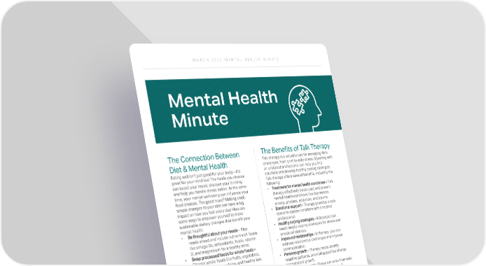 MARCH 2025 MENTAL HEALTH MINUTE Mental Health Minute The Connection Between The Benefits of Talk Therapy Diet & Mental Health Talk therapy is a valuable tool for managing life’s challenges, from grief to daily stress. Speaking with Eating well isn’t just good for your body—it’s an unbiased professional can help you find great for your mind too! The foods you choose solutions and develop healthy coping strategies. can boost your mood, sharpen your thinking, Talk therapy offers several benefits, including the and help you handle stress better. At the same following: time, your mental well-being can influence your • Treatment for mental health conditions – Talk food choices. The good news? Making small, therapy effectively treats past and present simple changes to your diet can have a big mental health conditions like depression, impact on how you feel every day! Here are anxiety, phobias, addiction, and trauma. some ways to empower yourself to make • Emotional support - Therapy provides a safe sustainable dietary changes that benefit your space to explore emotions with a trusted mental health: professional. • Be thoughtful about your meals - Plan • Healthy coping strategies - A therapist can meals ahead and include nutrient-rich foods teach helpful coping strategies for stress and like omega-3s, antioxidants, folate, vitamin emotional distress. D, and magnesium for a healthy mind. • Improved relationships - In therapy, you can • Swap processed foods for whole foods – address relationship challenges and improve Choose whole foods like fruits, vegetables, communication. whole grains, lean proteins, and healthy fats • Personal growth - Therapy helps identify for a more nutrient-dense diet. negative patterns, promoting positive change • Stay hydrated – drinking plenty of water and personal growth. supports overall health, mood, and • Stress management - Stress can arise from daily cognitive function. life or major events like divorce or loss. A • Listen to your body – Track your meals and therapist can help you navigate these moods in a food journal to identify foods challenges and offer a safe space to express that boost your energy and well-being. your feelings. Your diet greatly affects your mental health. Talk therapy can ease emotional distress, but it’s Eating nutrient-rich foods while limiting sugar helpful to start even before challenges arise. and saturated fat can boost focus, cognition, Seeing a therapist early can make future difficulties and mental well-being. March is National easier to handle. Contact a mental health Nutrition Month—a perfect time to prioritize professional for guidance. healthy eating! For guidance, consult a registered dietitian. 401 Pennsylvania Pkwy, Suite 200 Office: Indianapolis, IN 46280 Population Health: LHDbenefits.com [email protected]
