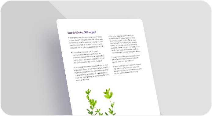 P. 12 Step 3: Offering EAP support If the employee identifies a personal or work-related problem during the meeting, remember to listen and acknowledge what the employee is saying. You then have the opportunity to combine the performance discussion with an offer of support through the EAP. • If the problem disclosed is work-related, communicate to the employee that you are available to support him or her on work-related issues. Also, if appropriate, suggest contact with the EAP as an additional source of support As a manager or supervisor please note that when an employee accesses for work-related issues, the EAP must remain neutral and can not advocate on behalf of the employee. Accessing EAP support does not mean that the employee can ignore the performance issues as identified. • If the problem disclosed is personal, suggest contactwith the EAP without further discussing the employee’sspecific situation. This will direct the employee to the most appropriate resources for help, and it will also help you set appropriate boundaries with the employee. It’s important for you to help the employee understand that you do not have the expertise to problem-solve personal issues Have EAP contact information readily available and ensure that the employee understands that the program is voluntary and confidential. It’s important for you to remind the employee that your performance feedback is limited to his or her on-the-job performance and not any personal problem that has surfaced in the meeting.