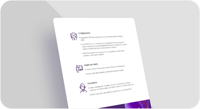 P. 5 Your EAP offers a hands-on approach to problem solving that saves you time and energy. A helping hand • Suggest the EAP to employees when you are concerned about wellbeing or safety • Use the EAP as an aid to performance management. This is not designed or meant to replace your existing internal HR performance management processes or protocols, but to provide additional support or resources • Offer EAP support to an employee if he or she expresses concern about a personal or work-related challenge Insight and clarity • Check out online resources on a variety of health and wellness topics • Receive information to better understand an employee’s situation Consultation • Call for a management consultation on how to handle sensitive employee issues; you can explore options, brainstorm solutions and work on action plans • Call to receive advice and expertise in areas that you may not specialize in