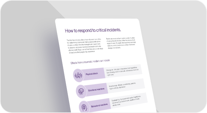 P. 17 How to respond to critical incidents. The first few minutes after a traumatic event are critical for determining injuries and taking appropriate action. It’s also a critical time for managers and supervisors to observe employee reactions and reach out to any affected staff. Keep in mind that there are a wide range of reactions that people may experience. The first and most profound reaction is often the effect of being physically shocked. When the physical shock begins to wear off, people often experience secondary reactions, which can produce a variety of behavioral changes in employees. Effects from a traumatic incident can include: Physical shock Emotional reactions Behavioral reactions Chest pains, dizzy spells, headaches, heart palpitations, lack of energy, neck or back pain, restlessness, insomnia/ nightmares. Mood swings, difficulty concentrating, paranoia, hyper-alertness, depression. Daydreaming, decreased work quality, forgetfulness, reluctance to go back to work, repetition of tasks already done.