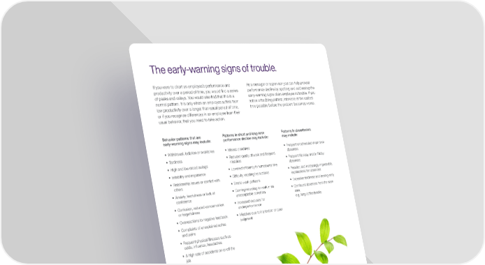P. 8 If you were to chart an employee’s performance and productivity over a period of time, you would find a series of peaks and valleys. You would also find that this is a normal pattern. It is only when an employee suffers from low productivity over a longer than usual period of time, or if you recognize differences in an employee from their usual behavior, that you need to take action. As a manager or supervisor you can help prevent performance decline by spotting and addressing the early-warning signs of an employee in trouble. If you notice a troubling pattern, intervene at the earliest time possible before the problem becomes worse. • Withdrawal, isolation or avoidance • Tardiness • High and low mood swings • Irritability and impatience • Relationship issues or conflict with others • Anxiety, fearfulness or lack of confidence • Confusion, reduced concentration or forgetfulness • Overreactions to negative feedback • Complaints of unexplained aches and pains • Frequent physical illnesses such as colds, influenza, headaches • A high rate of accidents on or off the job • Missed deadlines • Reduced quality of work and frequent mistakes • Lowered efficiency in turnaround time • Difficulty recalling instructions • Erratic work patterns • Coming/returning to work in an unacceptable condition • Increased excuses for underperformance • Mistakes due to inattention or poor judgment • Frequent unscheduled short-term absences • Frequent Monday and/or Friday absences • Peculiar, and increasingly improbable, explanations for absences • Excessive tardiness and leaving early • Continued absences from the work area, e.g. long coffee breaks Behavior patterns that are early-warning signs may include: Patterns in short and long-term performance decline may include: Patterns in absenteeism may include: The early-warning signs of trouble.