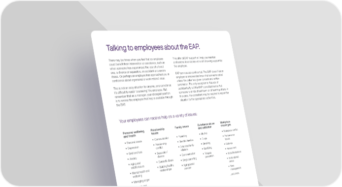 P. 6 There may be times when you feel that an employee could benefit from intervention or assistance, such as when someone has experienced the loss of a loved one, a divorce or separation, an accident or a severe illness. Or perhaps an employee has approached you in confidence about a personal or work-related issue. This is not an easy situation for anyone, and sometimes it’s difficult to resist ‘counseling’ the employee. But remember that as a manager, your strongest position is to remind the employee that help is available through the EAP. This offer of EAP support will help you maintain professional boundaries while still showing support for the employee. EAP services are confidential. The EAP doesn’t let an employer or anyone else know that someone called unless the caller has given consent and written permission. The only exception to this rule of confidentiality is if the EAP consultant learns that someone is at risk of self-harm or of harming others. In this case, the consultant may be required to report the situation to the appropriate authorities. • Personal stress • Depression • Grief and loss • Anxiety • Aging and midlife issues • Mental health and wellbeing • Managing anger • Lifestyle and health changes • Crisis situations • Traumatic experiences • Financial consulting • Legal issues • Communication • Relationship conflict • Separation/ divorce • Domestic abuse • Building healthy relationships • Parenting • Blended families • Extended family relations • Communication • Single parenting • Aging parent concern • Alcohol • Drugs • Smoking • Gambling • Relapse prevention • Workplace conflict • Performance issues • Violence • Harassment • Work-life balance • Work-related stress • Time management ...and more. Personal wellbeing and health Relationship issues Family issues Substance abuse and addiction Workplace challenges Talking to employees about the EAP. Your employees can receive help on a variety of issues: